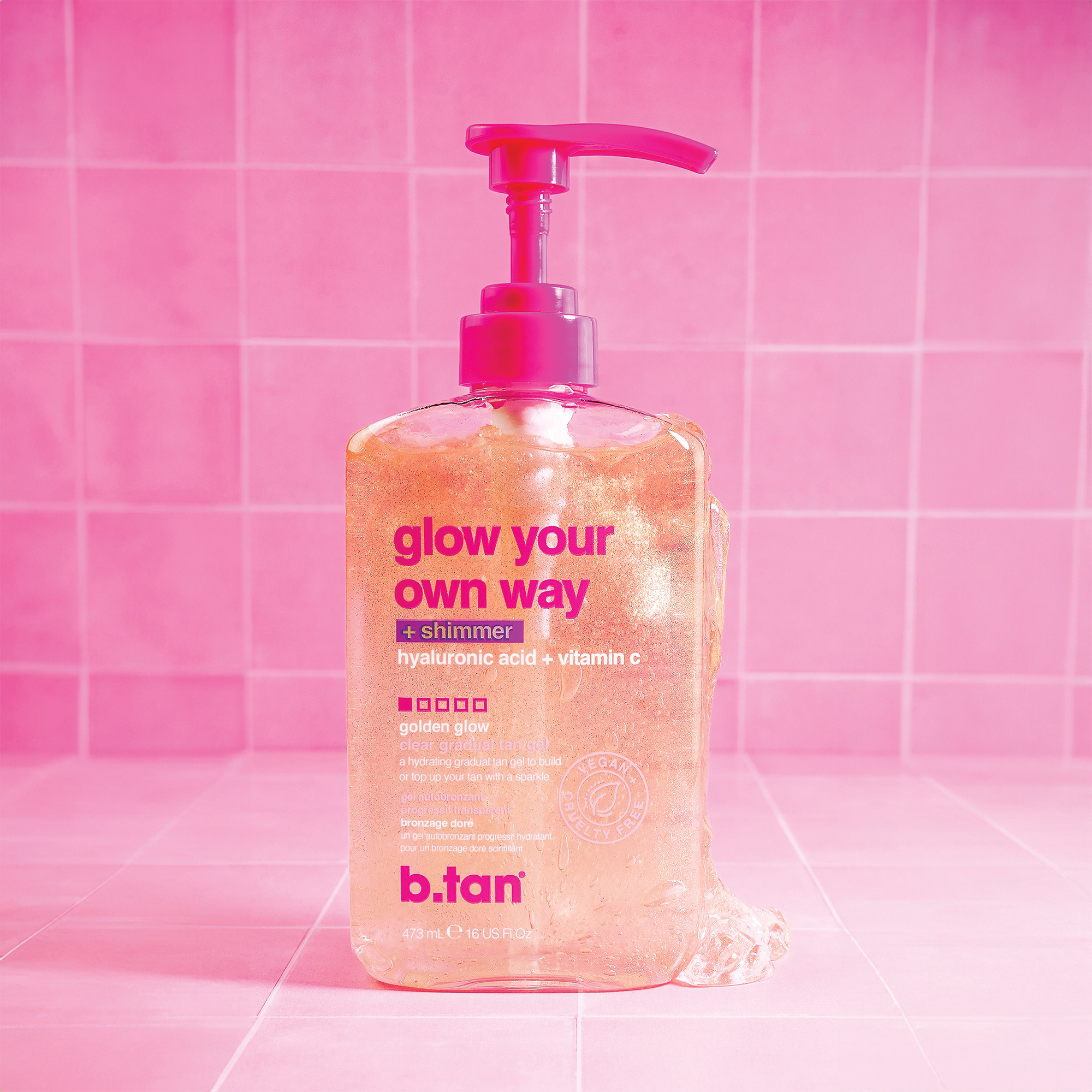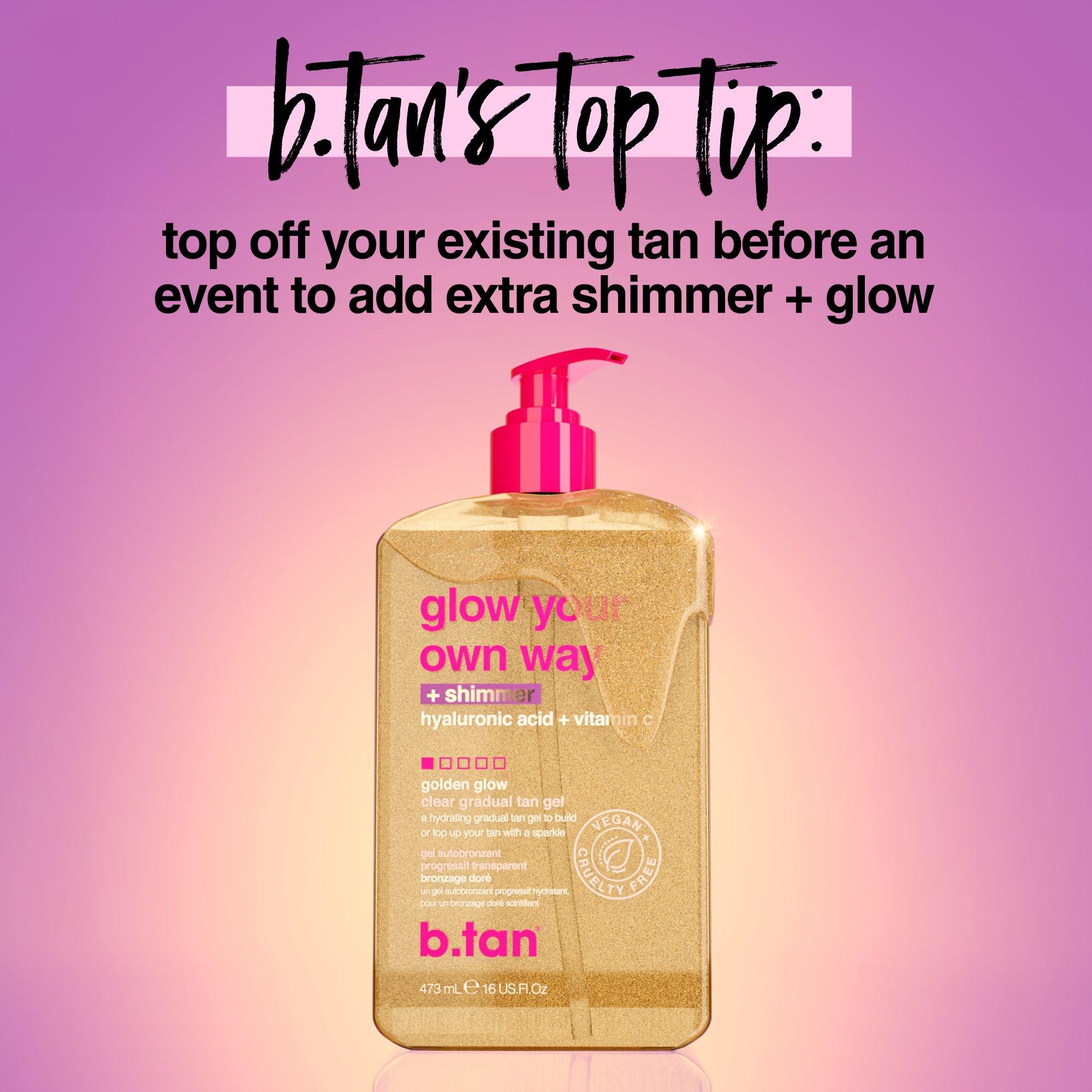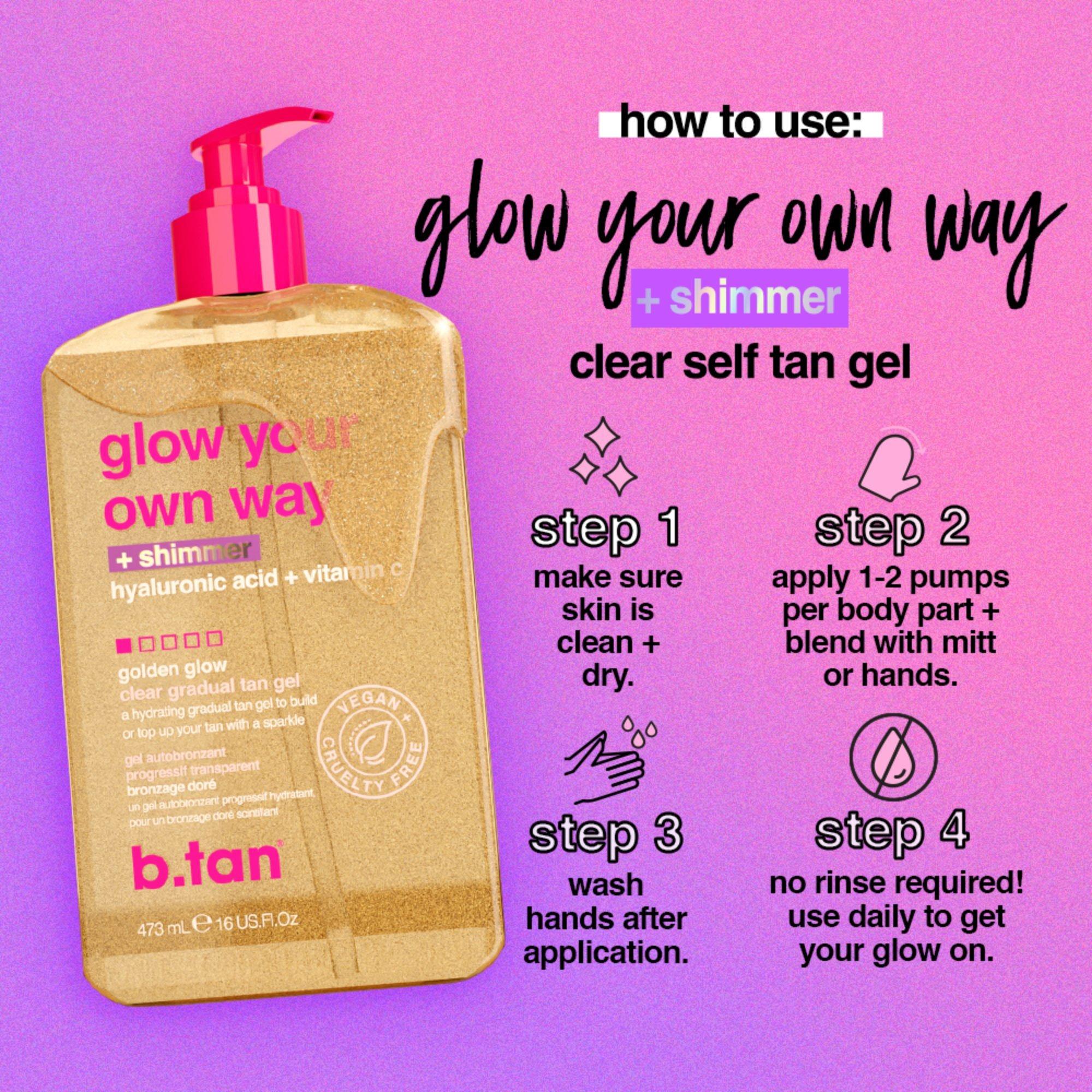 b.tan Glow Your Own Way + Shimmer Shimmering Clear Self Tan Gel - All that shimmers might be gold! A self tan gel with gold shimmer to sparkle like the bright diamond you are, all while tanning yourself to golden perfection.