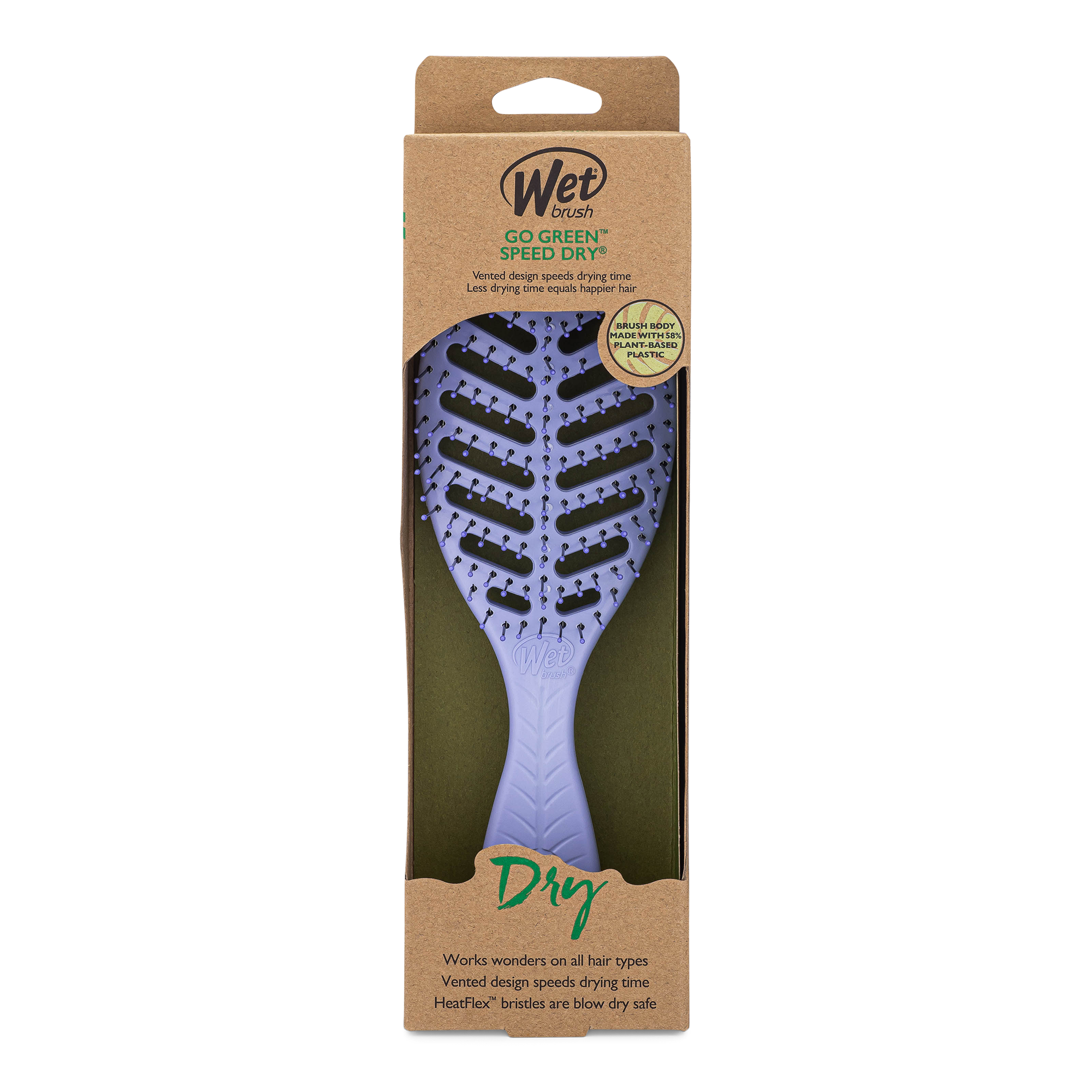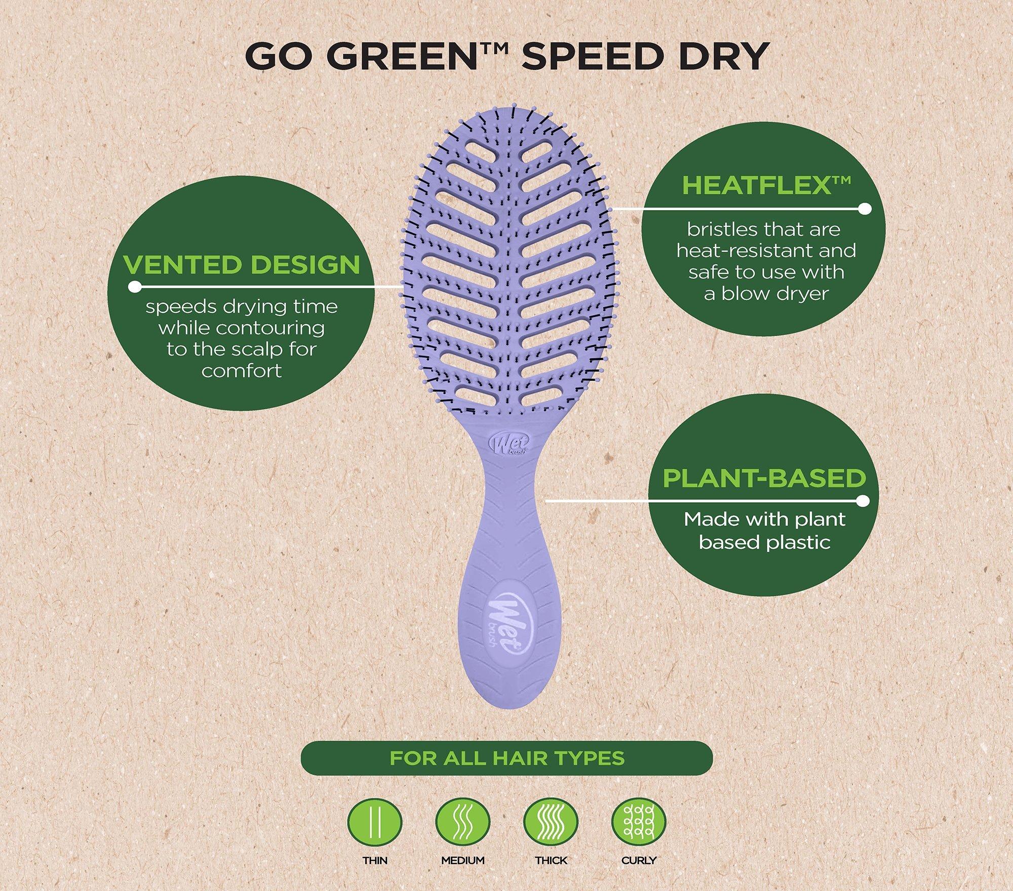 Meet the Wet Brush Go Green Speed Dry Brush. The Go Green Speed Dry dries your hair without drying it out. The brush's vented design speeds drying time by allowing moisture to escape faster, and its heat-resistant bristles gently detangle while blow-drying.