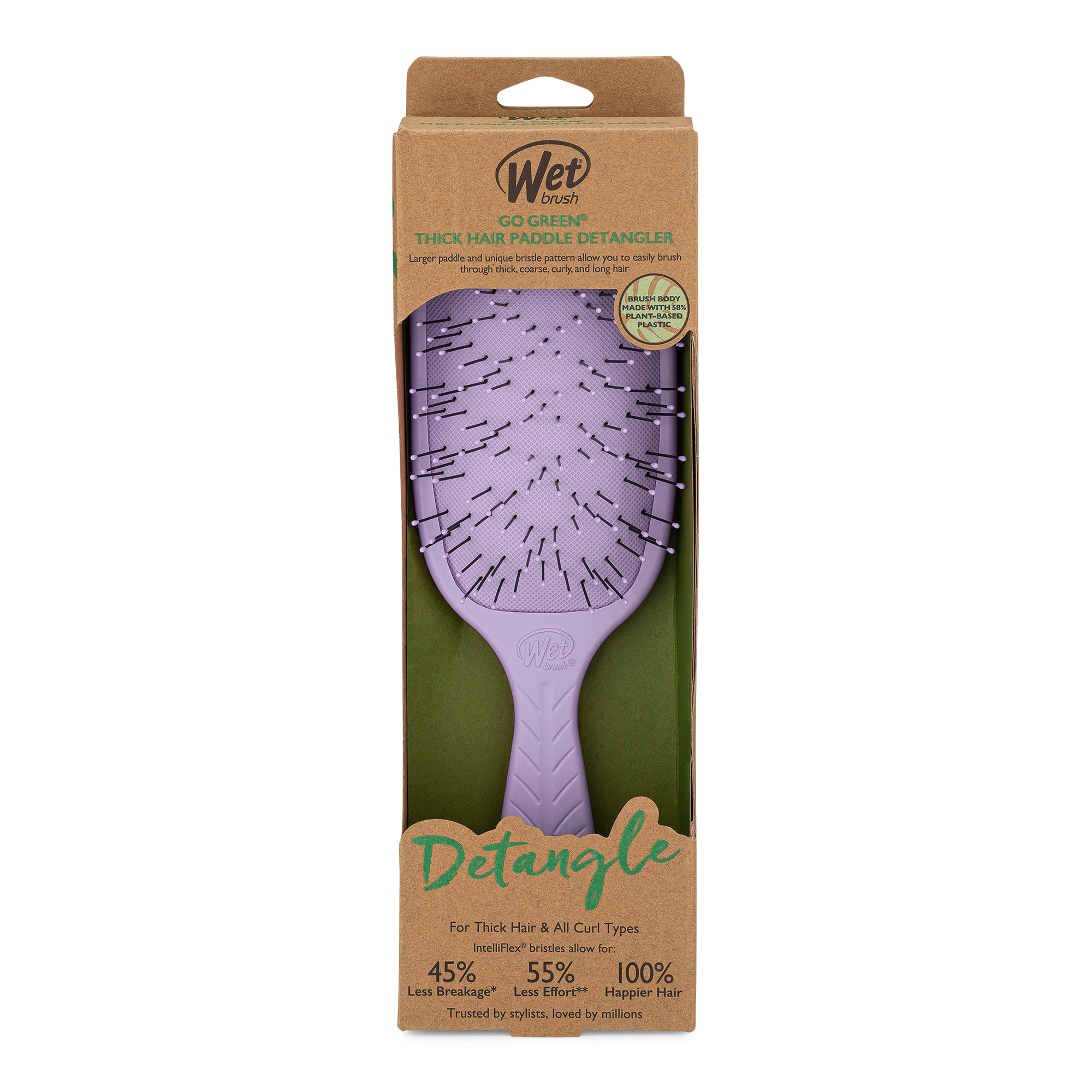Meet the Wet Brush Go Green Thick Hair Paddle Detangler. Exclusive ultra-soft IntelliFlex bristles arranged in a unique cluster pattern help glide through the thickest of strands with ease.