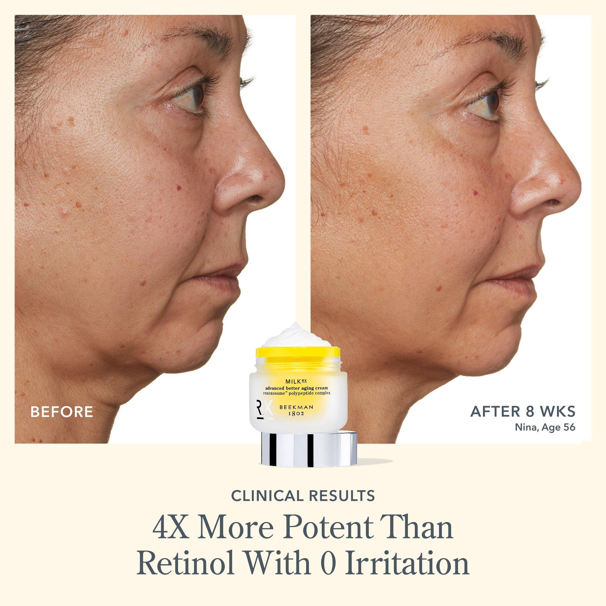 Milk RX Advanced Better Aging Cream: Apply daily morning and night after cleansing. Gently massage a dime-sized amount into the four quadrants of the face and down the neck.