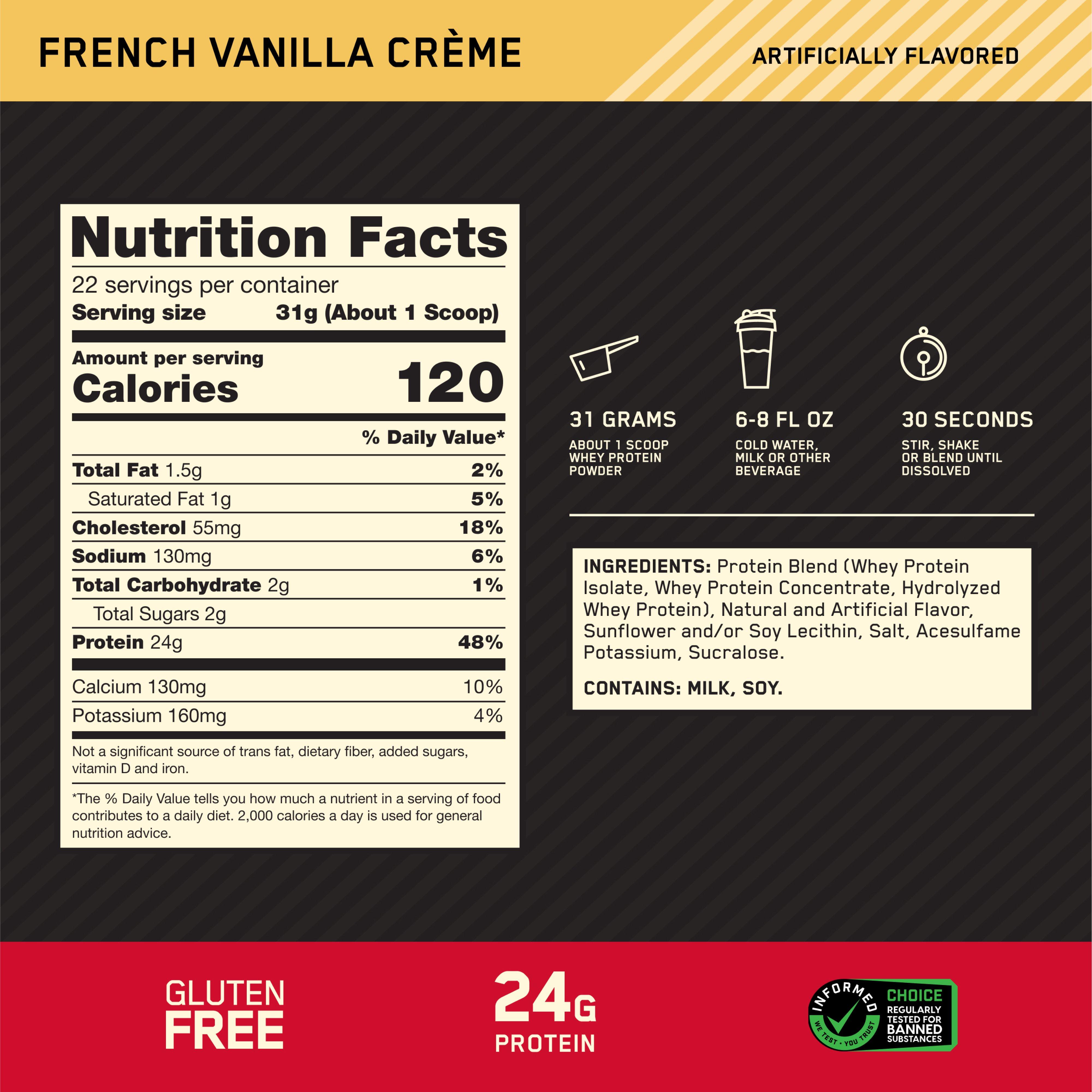 Fuel your training and recovery with Gold Standard 100% WheyTM from Optimum Nutrition—the world’s best-selling whey protein powder. Each serving delivers 24g of fast-digesting whey protein and 5.5g of naturally occurring BCAAs to help support lean muscle growth, strength, and post-workout recovery.