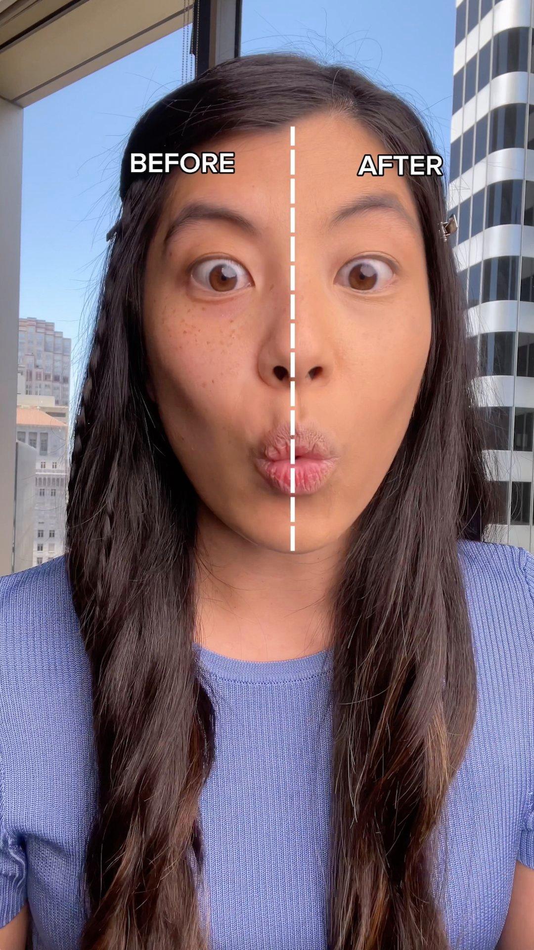 - Blend it out with a damp beauty sponge or small brush, or tap it into skin with your fingers.