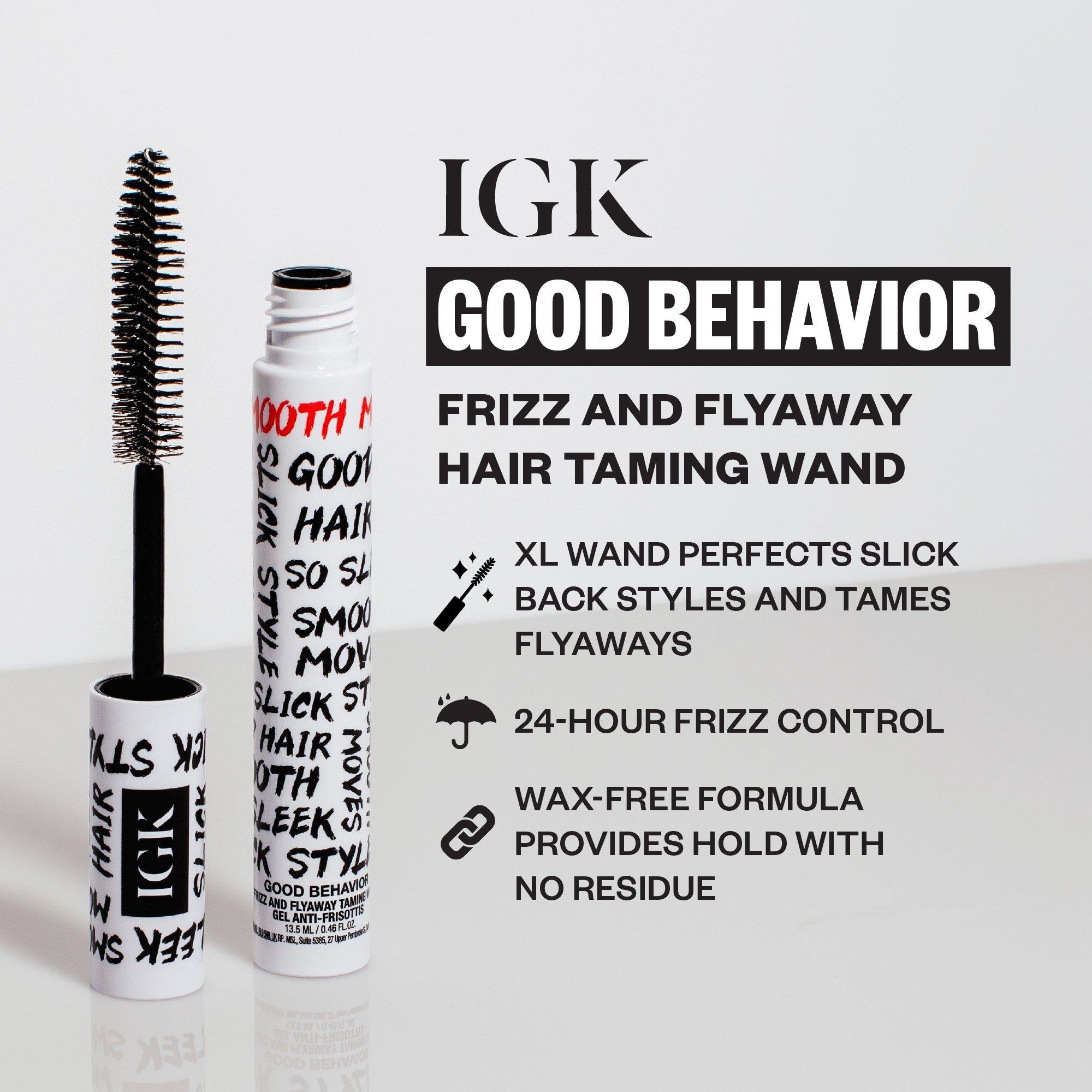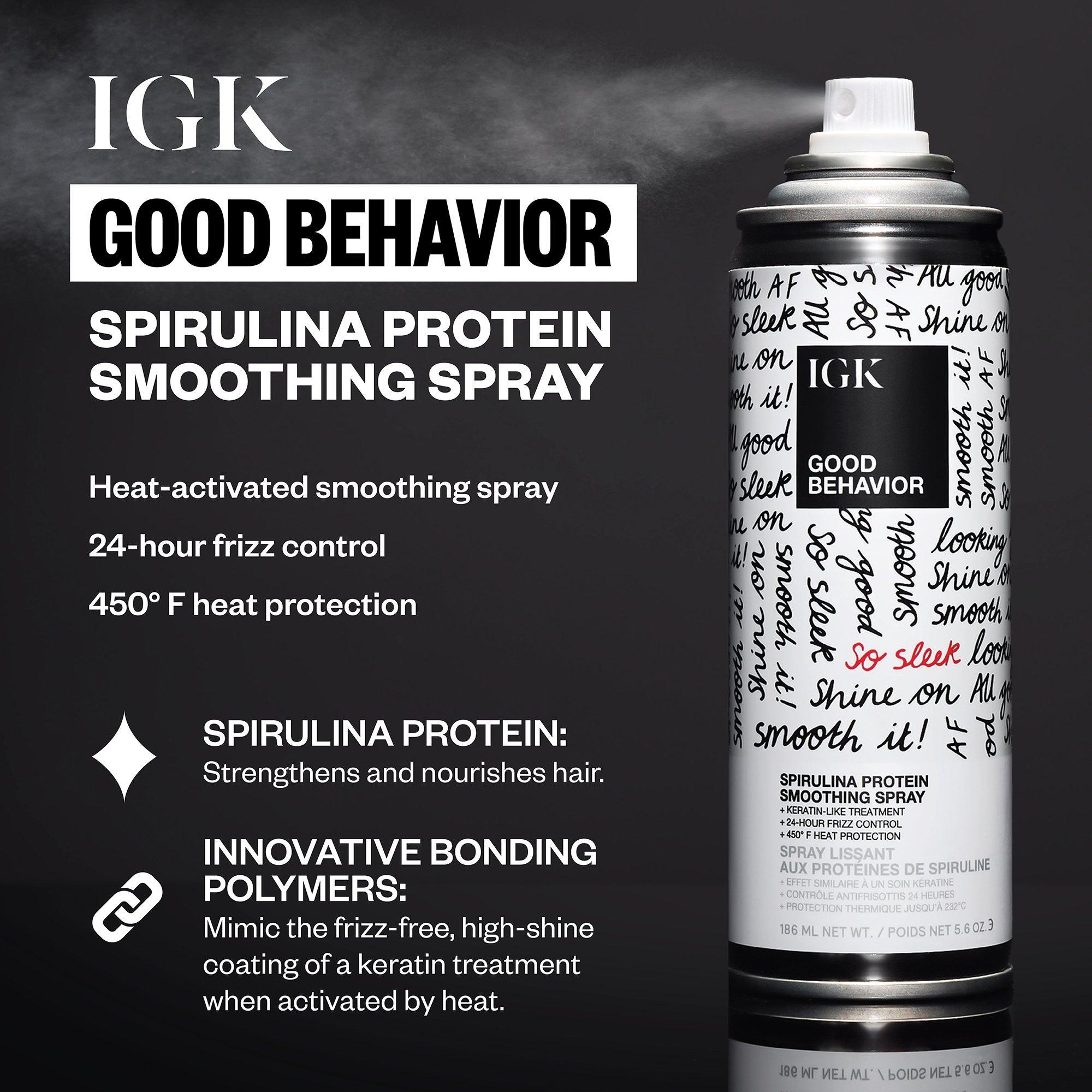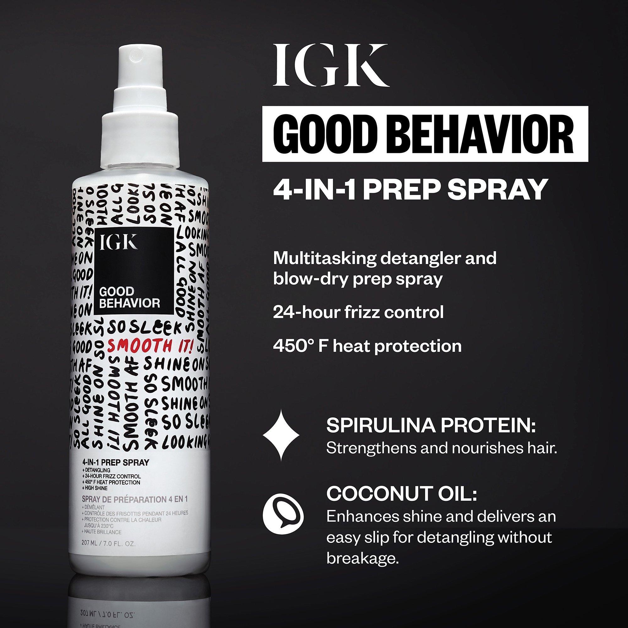 Prep, style and smooth for salon-worthy hair every day with IGK's viral best sellers. This Good Behavior trio provides 450° heat protection, fights frizz for up to 24 hrs, smooths and adds shine.