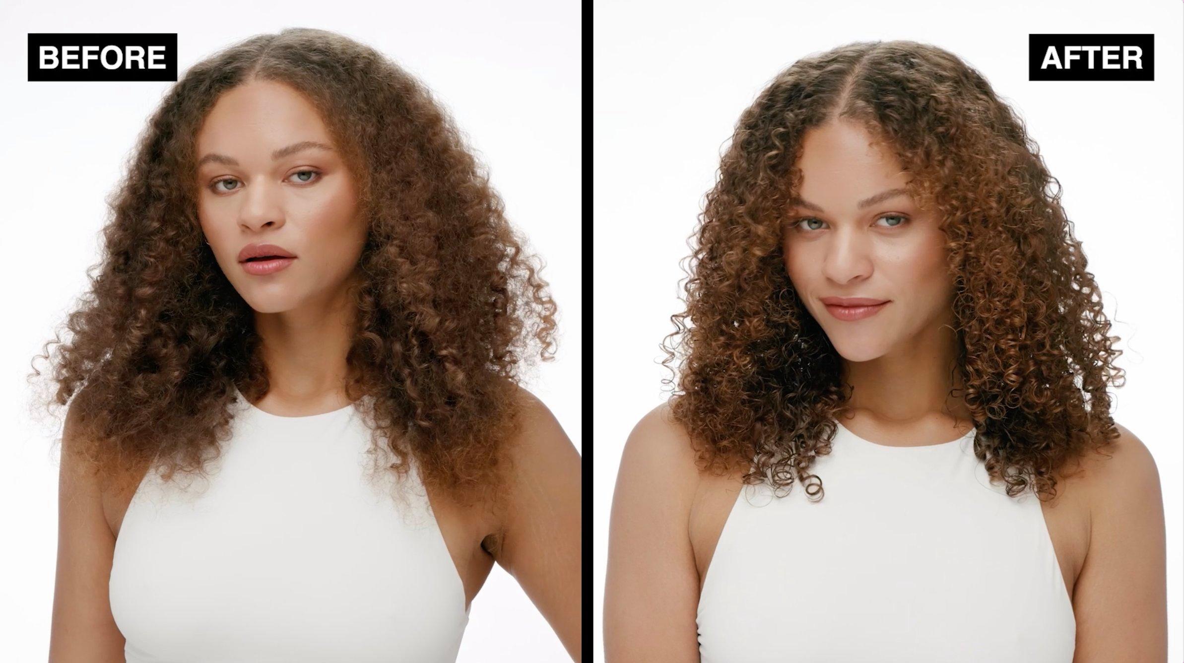Once dry, gently scrunch curls upside down to release the anti-frizz barrier and reveal touchably soft, defined curls.