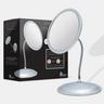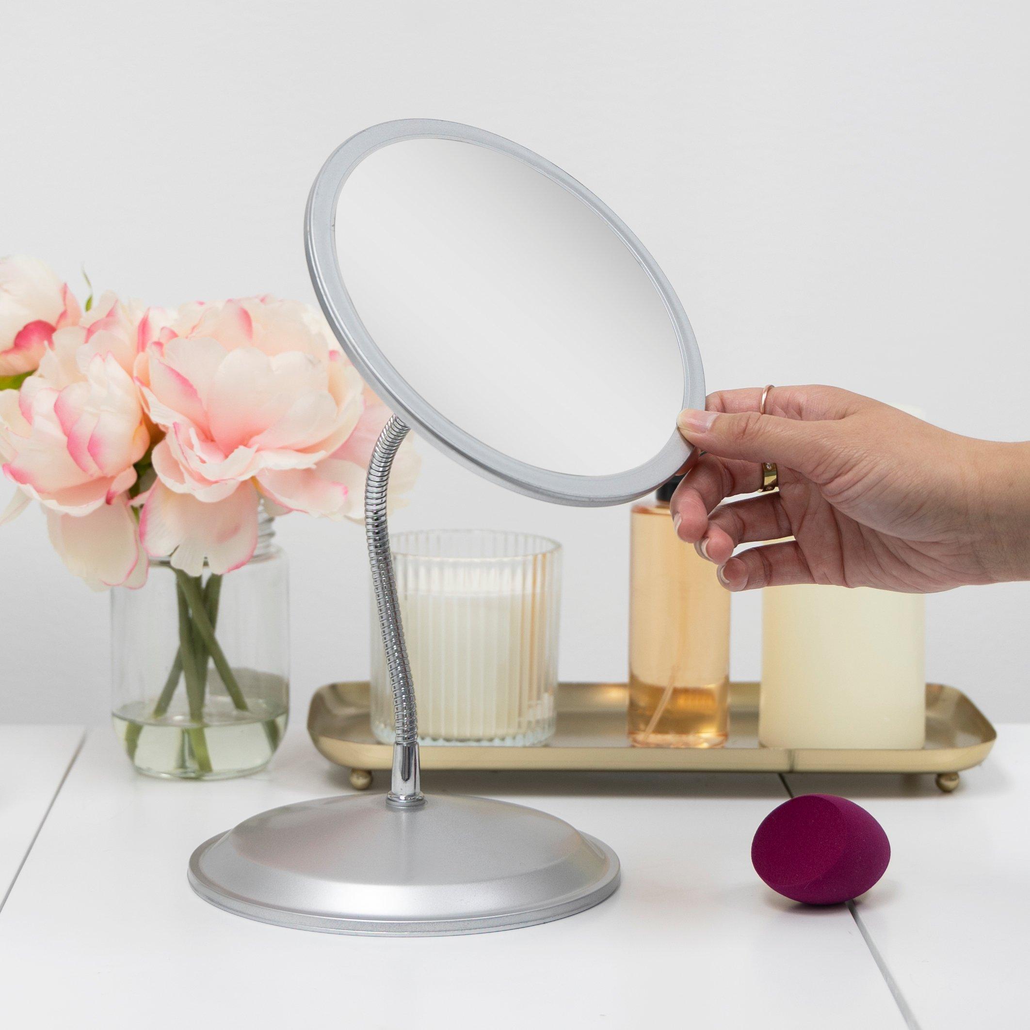 Crafted from optical quality glass, this silver face mirror is 7-inch diameter by 13-inch tall. The 9-inch stainless steel gooseneck stem ensures a perfect angle. Double-sided 10-times and 5-times magnifications provide the ideal clarity for makeup and hair.