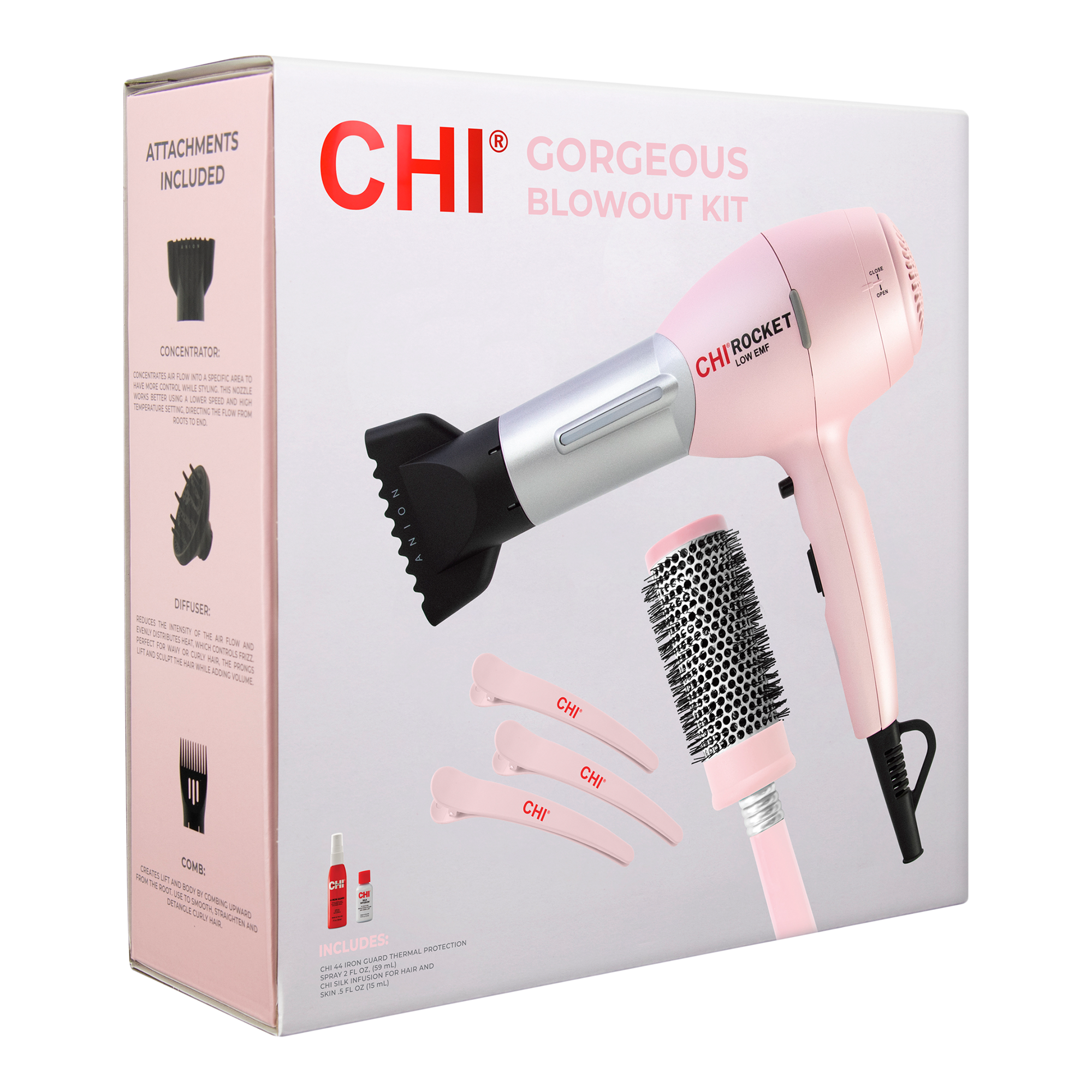 Every day is a gorgeous hair day with the CHI Gorgeous Blowout Kit! Featuring your favorite CHI essentials along with this powerful, lightweight hair dryer that helps dry hair quickly and leaves gorgeous shine.