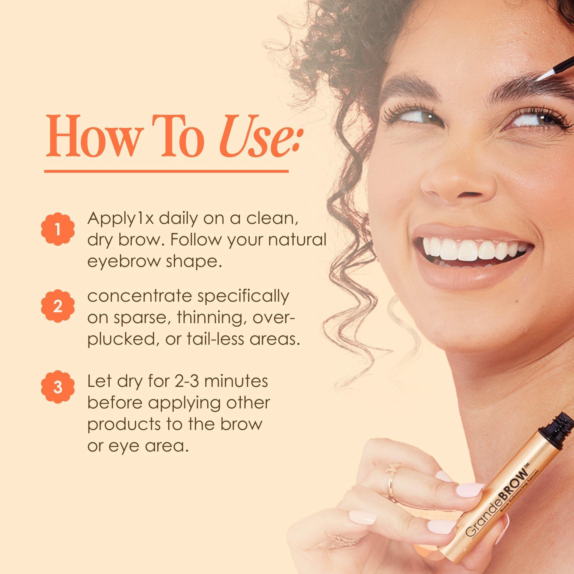 As with all cosmetic products used in the area of the eye (or close proximity to the eye), it is important to carefully read all directions and warnings. Carefully apply GrandeBROW once daily on a clean, dry brow to the natural shape of your brow, concentrating on sparse, thinning or over-plucked areas. Apply only with the product applicator provided. Allow 2-3 minutes for the serum to fully dry before applying other products to your brow or eye area. If serum gets into the eye, immediately rinse thoroughly with cool water to completely remove serum from the eye. Apply every day for a full 4 months. After desired improvement is achieved, apply every other day for maintenance. GrandeBROW requires continued use to maintain benefits.