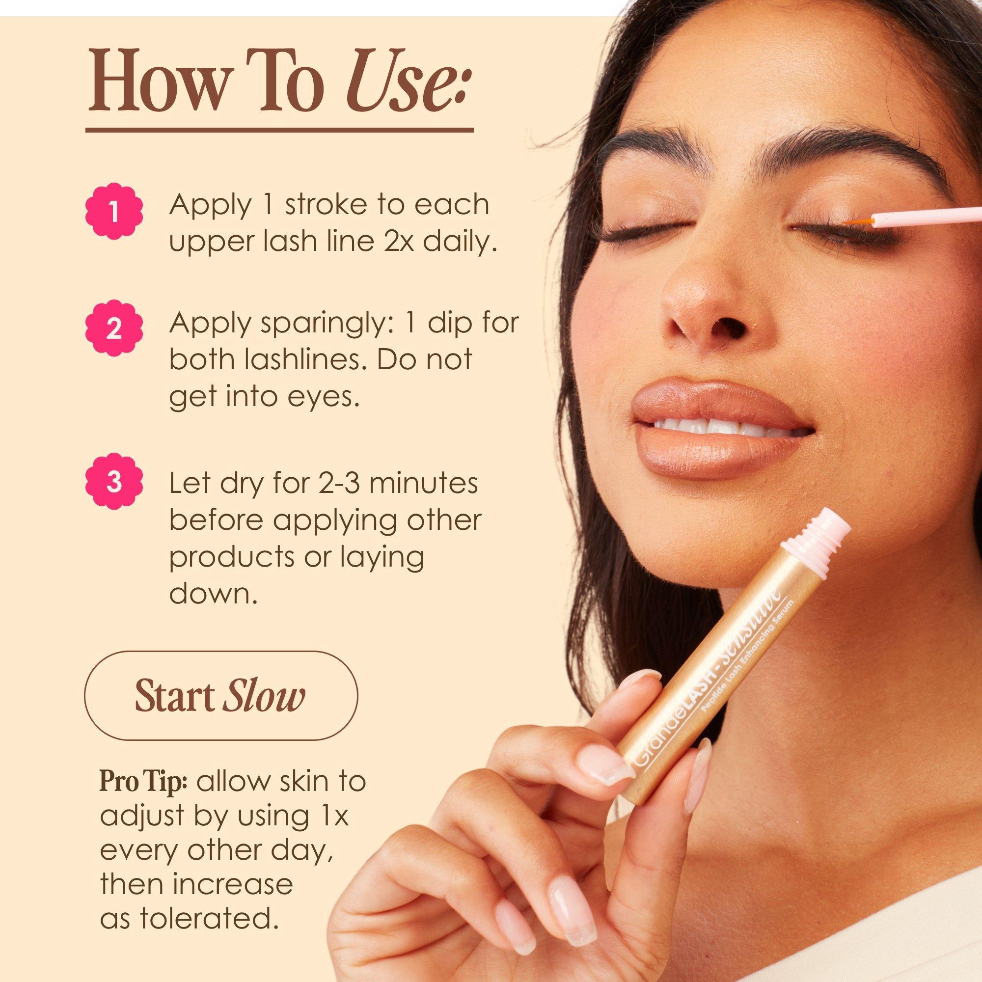 Use only one dip of the wand and apply a single stroke to each upper lash line 2x daily (AM \& PM). Avoid getting into eyes. Do not apply to the lower lash line. Allow 2--3 minutes to dry before applying other products or laying down. Use daily until desired results are achieved, then every other day for maintenance.