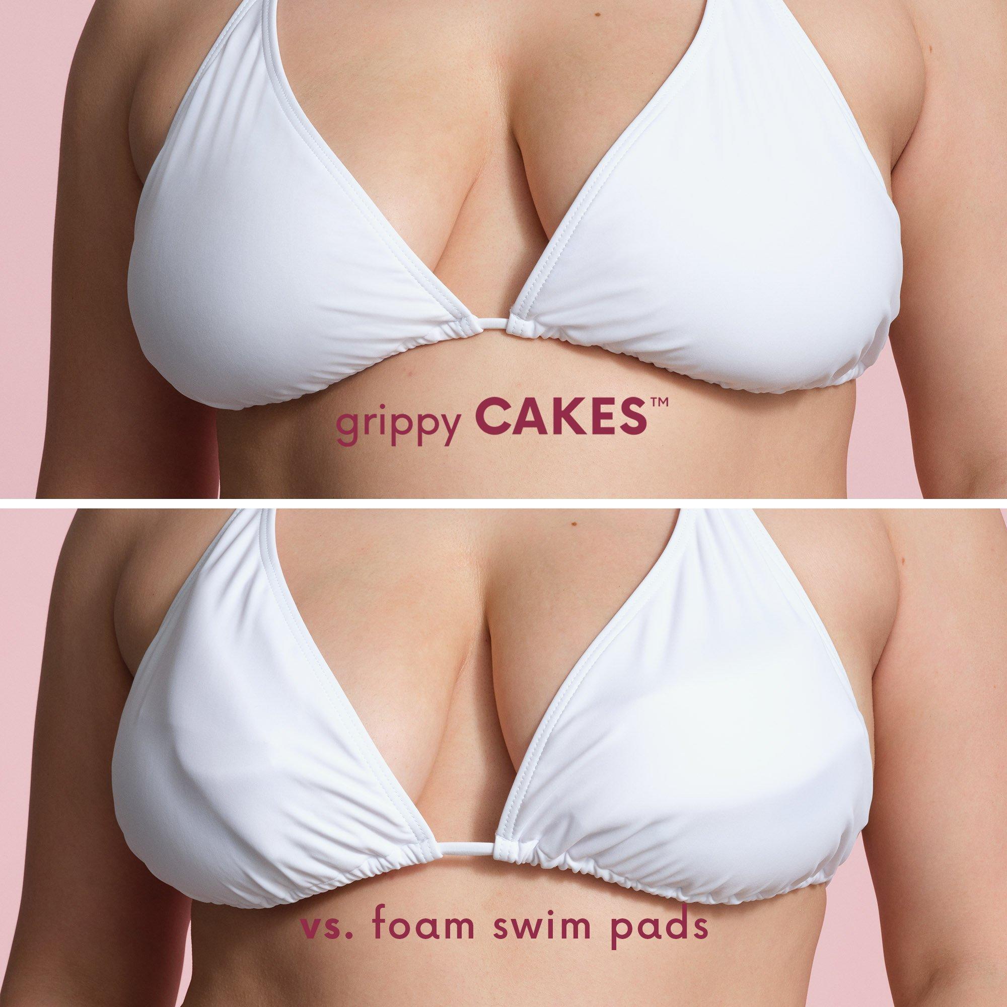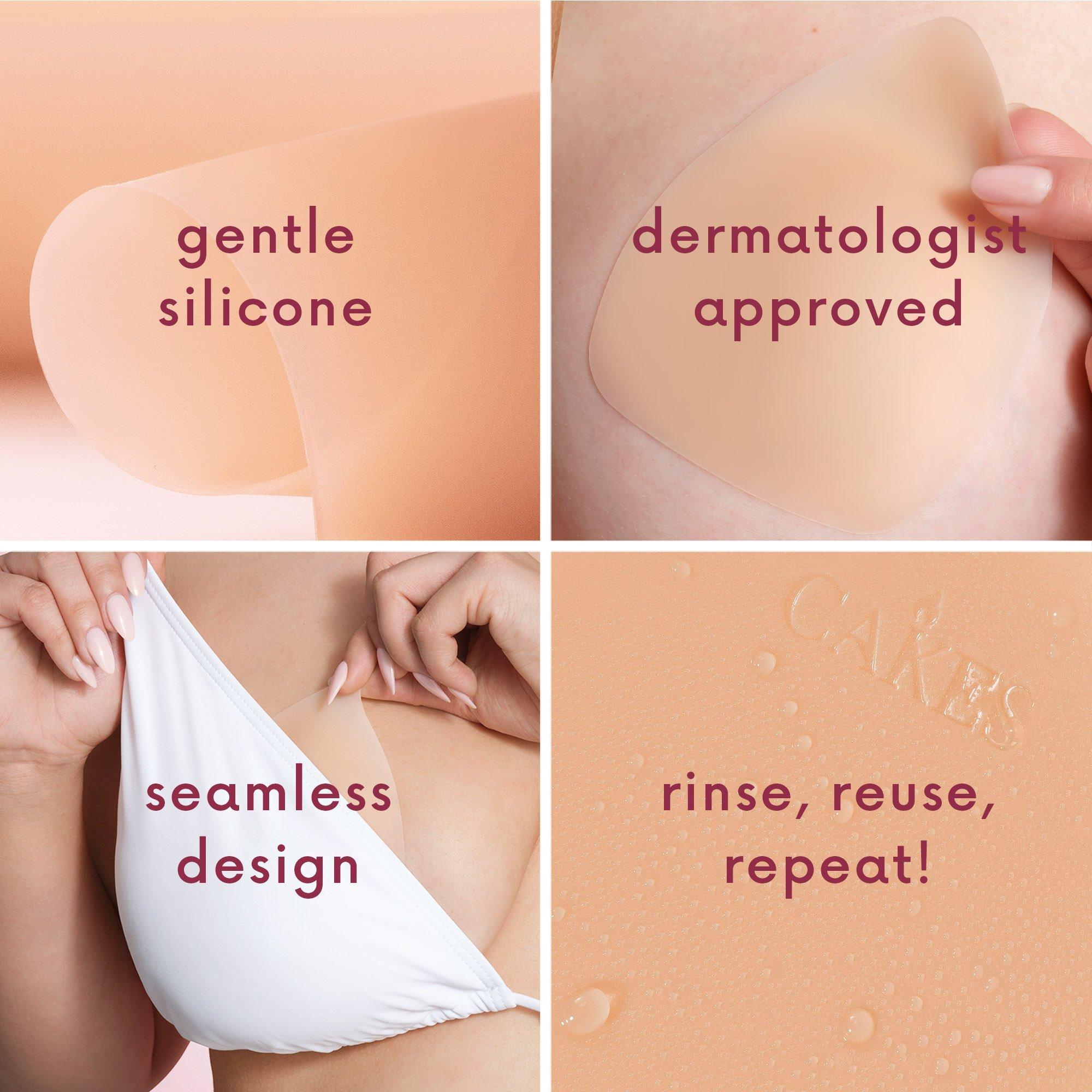 grippy CAKES triangles by CAKES body. These patent-pending, dermatologist tested & approved triangle covers offer seamless coverage and subtle shaping—no adhesive required. Designed to disappear under swimwear, sports bras, and snug-fitting deep vee styles.