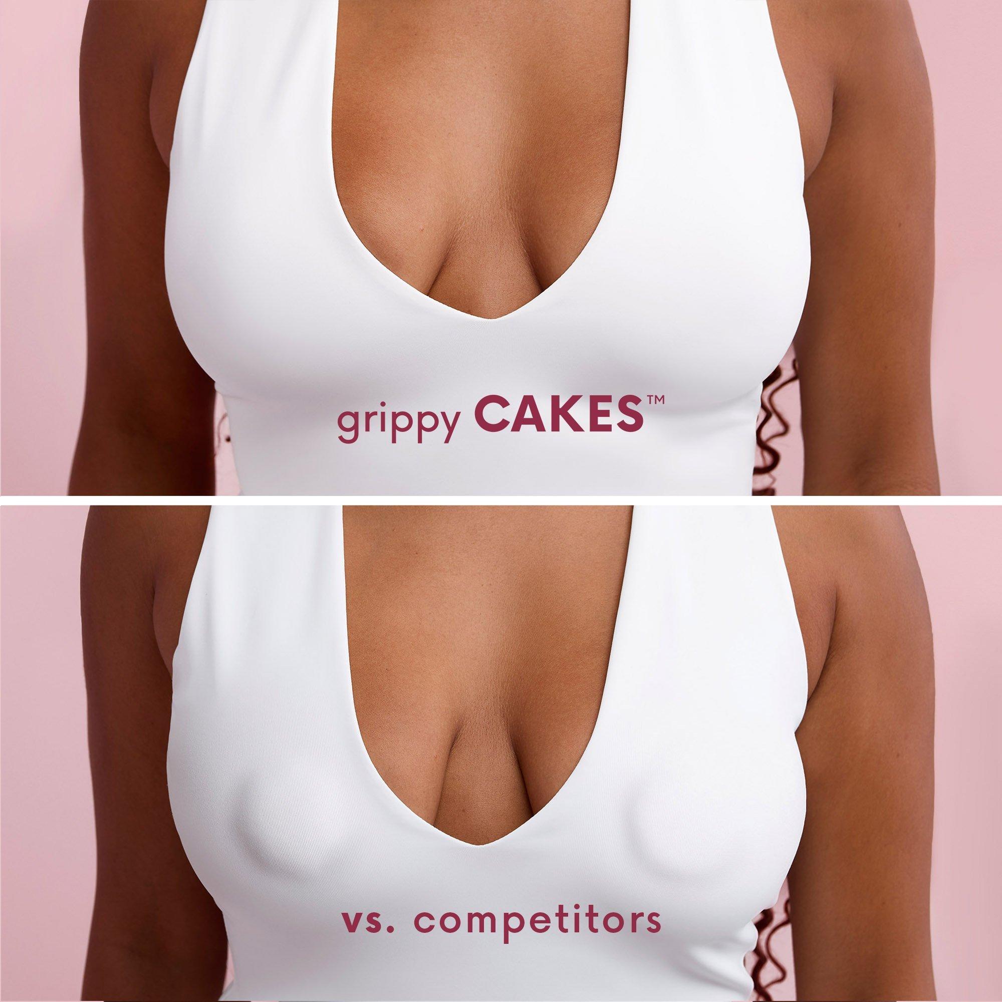 grippy CAKES triangles by CAKES body. These patent-pending, dermatologist tested & approved triangle covers offer seamless coverage and subtle shaping—no adhesive required. Designed to disappear under swimwear, sports bras, and snug-fitting deep vee styles.