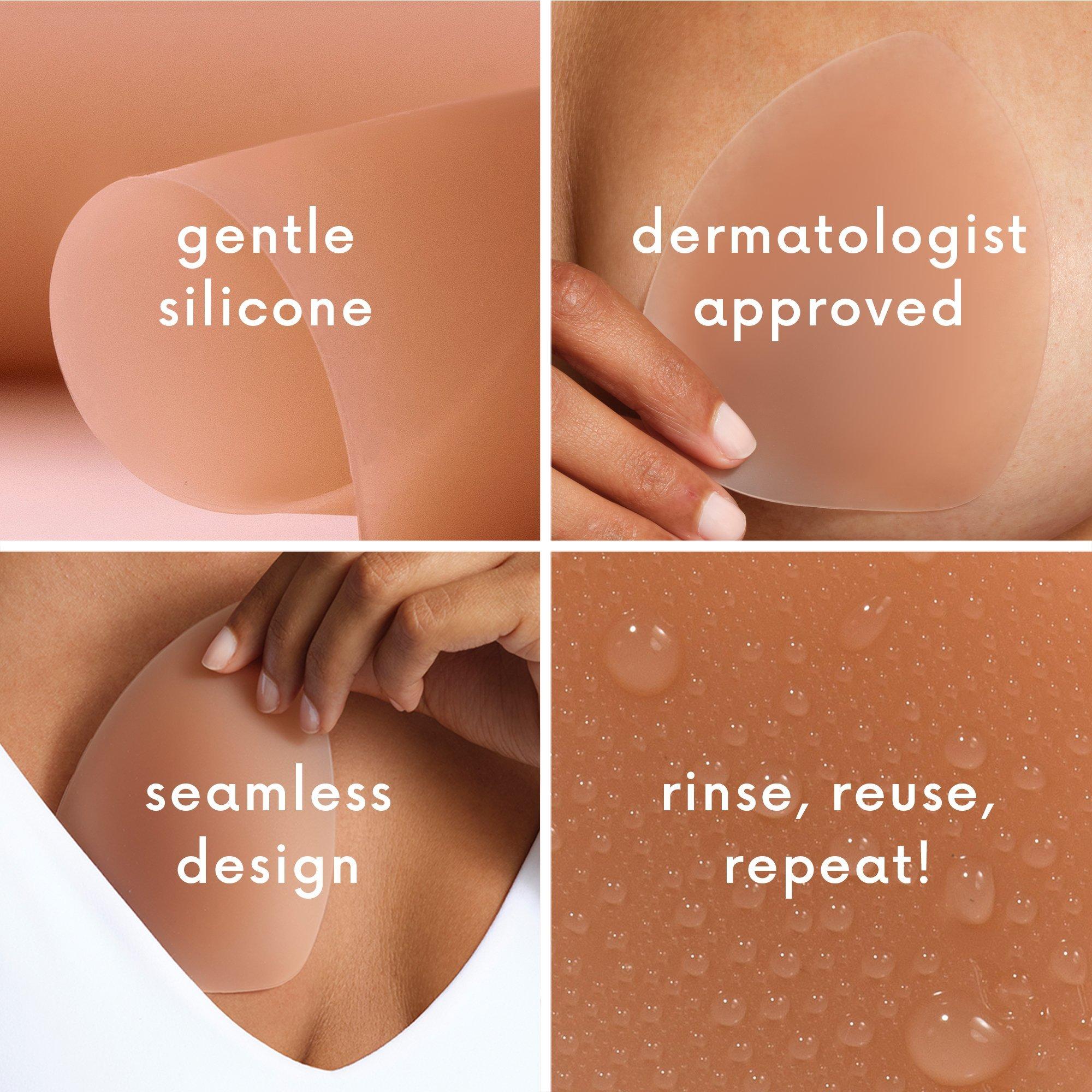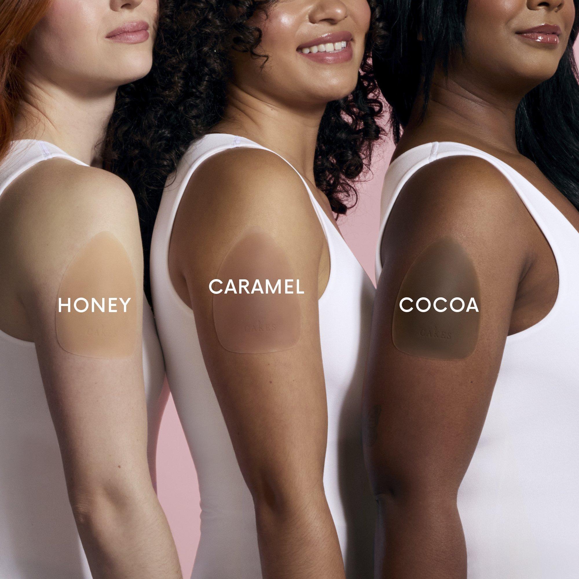 grippy CAKES triangles by CAKES body. These patent-pending, dermatologist tested & approved triangle covers offer seamless coverage and subtle shaping—no adhesive required. Designed to disappear under swimwear, sports bras, and snug-fitting deep vee styles.