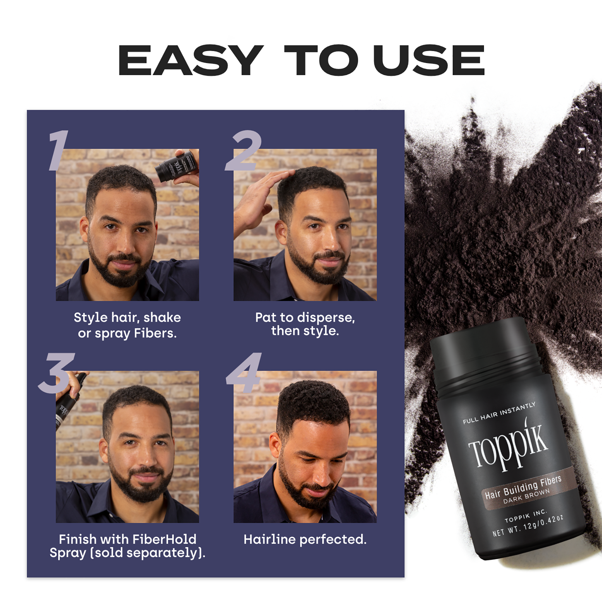 For Men and Women: Use on dry hair. Shake liberally into thinning areas. Gently pat hair to disperse Fibers. Style as usual. For greater durability, follow with Toppik FiberHold Spray.
