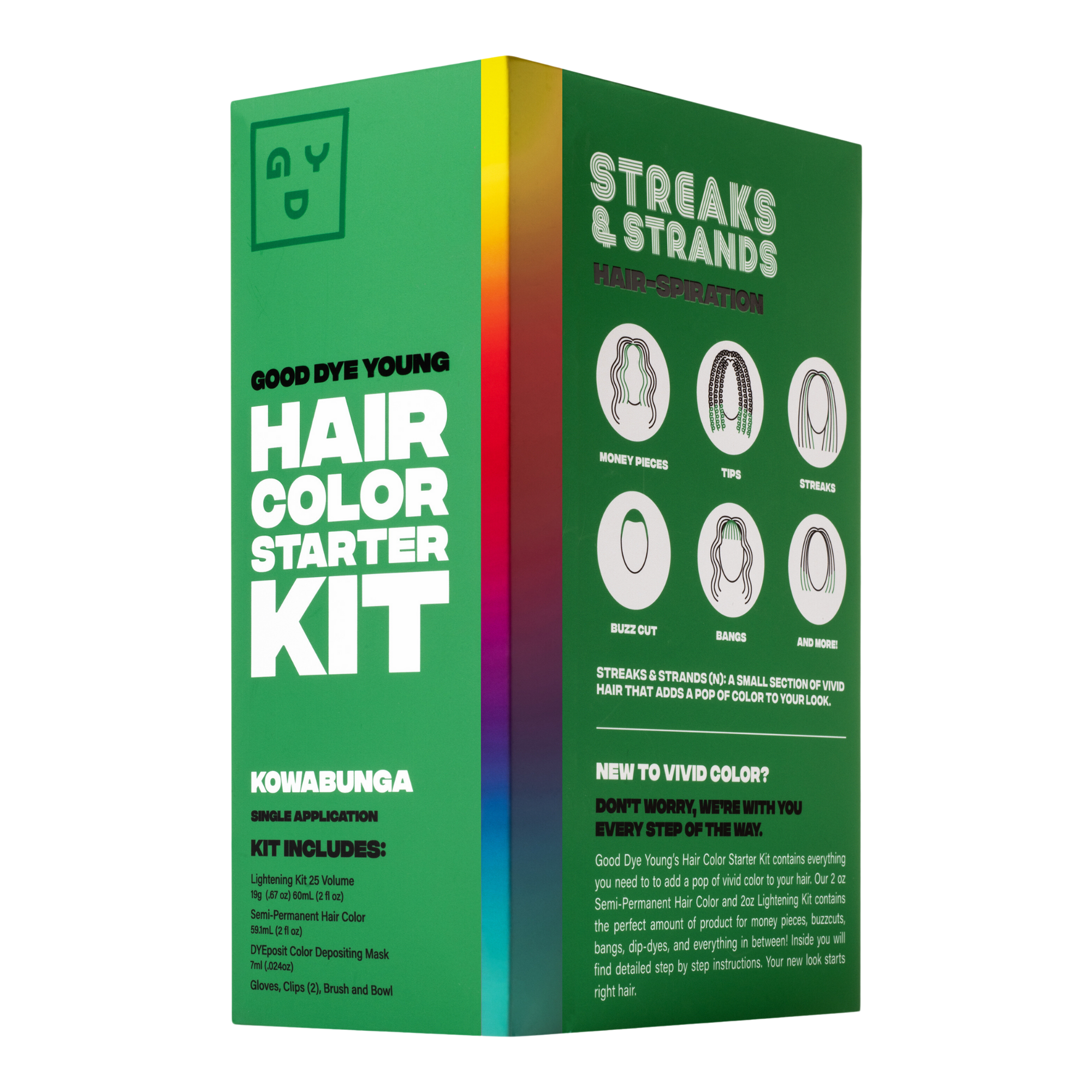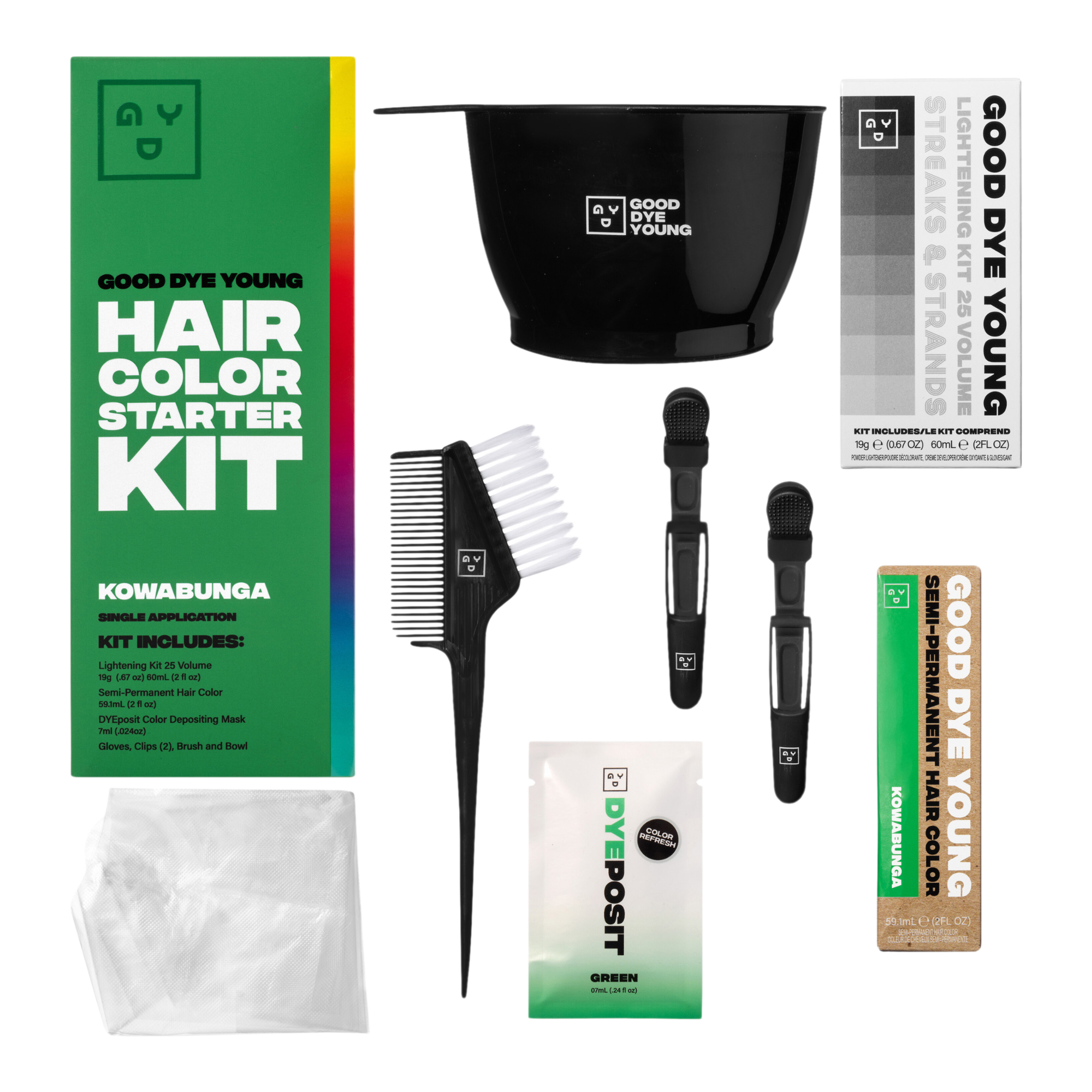 Good Dye Young's Hair Color Starter Kit contains everything you need to to add a pop of vivid color to your hair. Contains the perfect amount of product for money pieces, buzzcuts, bangs, dip-dyes, and everything in between!