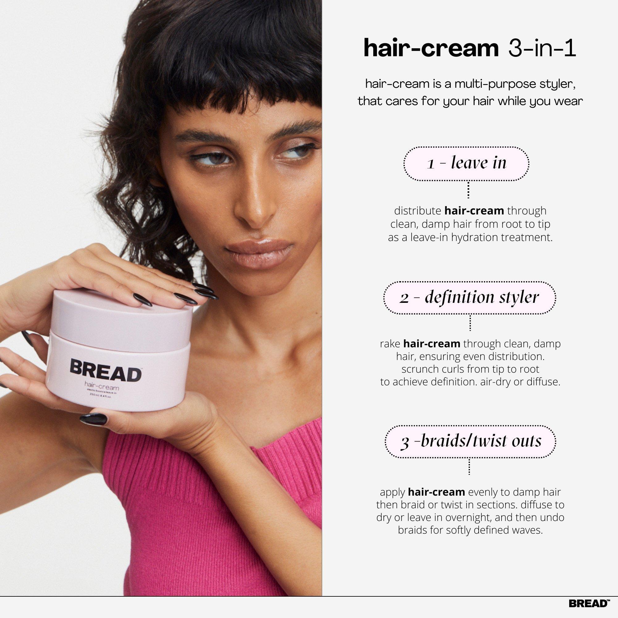 Bread Beauty Supply's Hair-Cream is a 2-in-1 leave-in conditioning and repairing curl cream that gives your curls a semi-defined, soft hold. This is your multipurpose, silicone-free, go-to leave-in curl cream for air-drying, diffusing, or braid-outs.