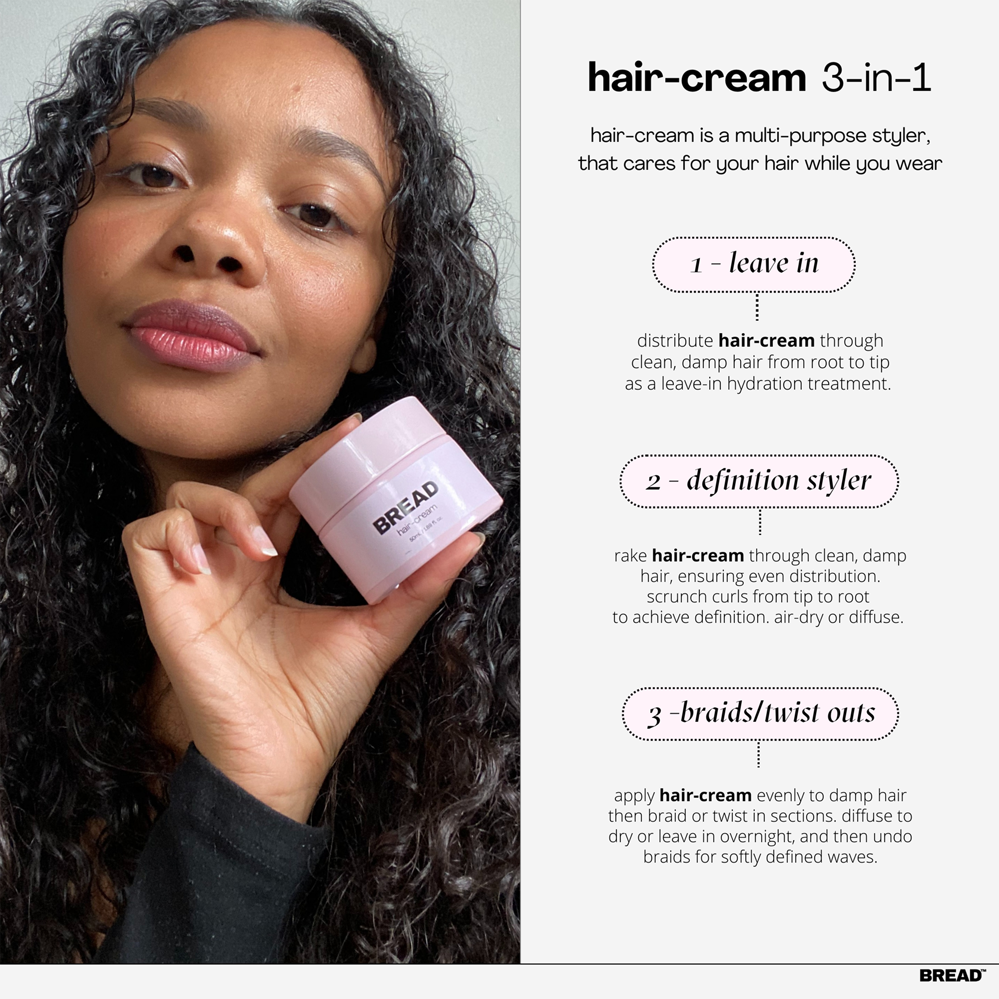 Bread Beauty Supply's Hair-Cream is a 2-in-1 leave-in conditioning and repairing curl cream that gives your curls a semi-defined, soft hold. This is your multipurpose, silicone-free, go-to leave-in curl cream for air-drying, diffusing, or braid-outs.