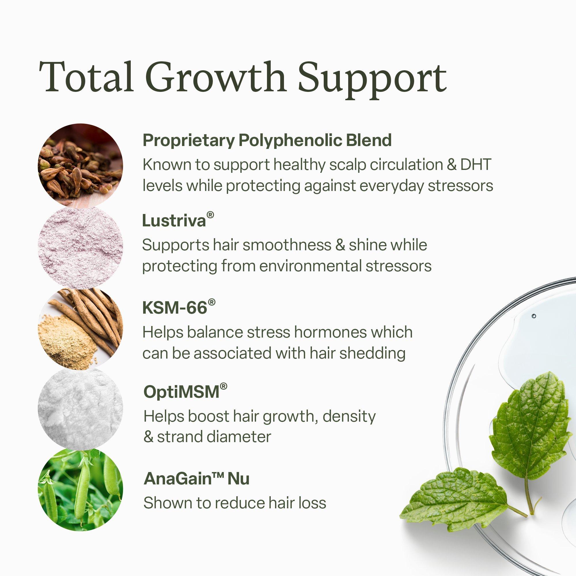 Five science-backed ingredients in a two-tablet daily dose, formulated to promote an active hair growth cycle in as little as 3 weeks. Target the most common causes of hair loss—hormones, stress, aging, nutrition, and environment—to help reduce shedding and improve hair growth, volume, and density.