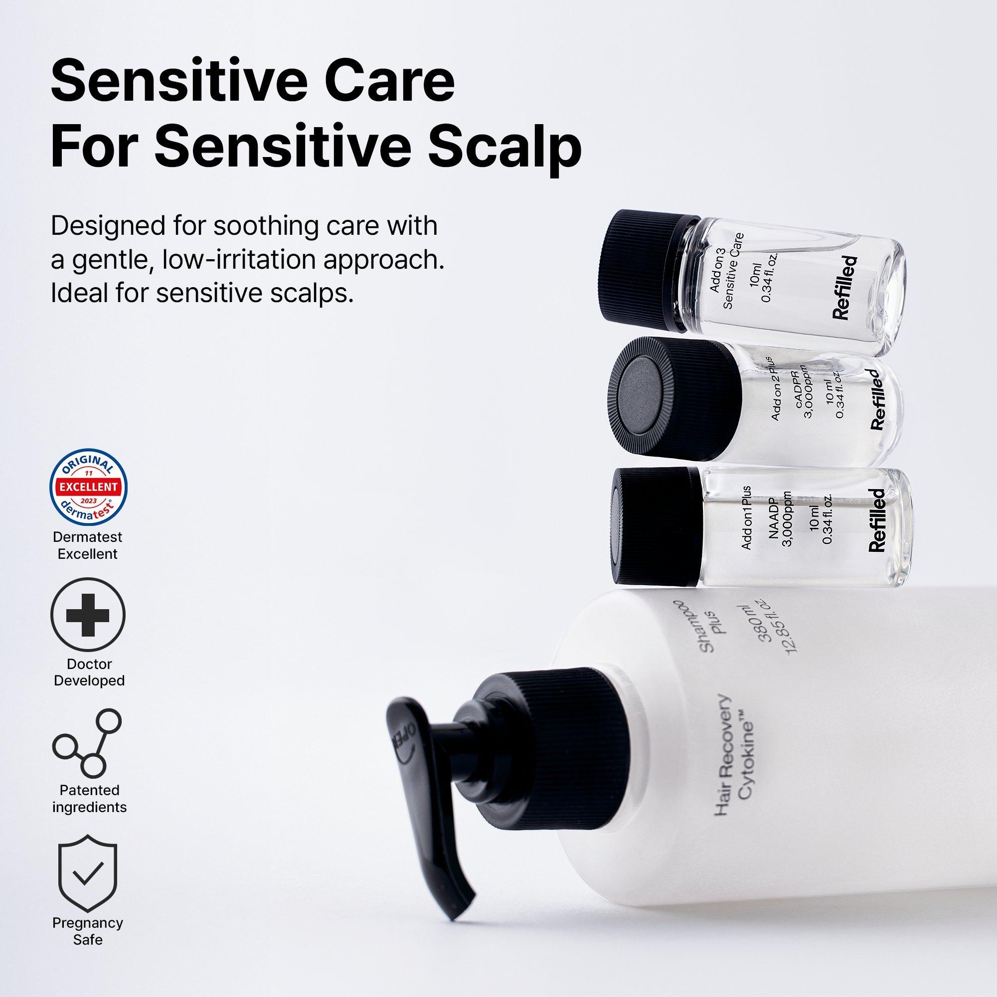 Refilled Hair Recovery Cytokine Shampoo Plus Sensitive Care is the gentlest formula for irritated scalps. With a powerful patented cytokine complex, it reduces shedding while calming sensitivity. Customizable add-on system. A soothing shampoo for a sensitive scalp and thinning hair.