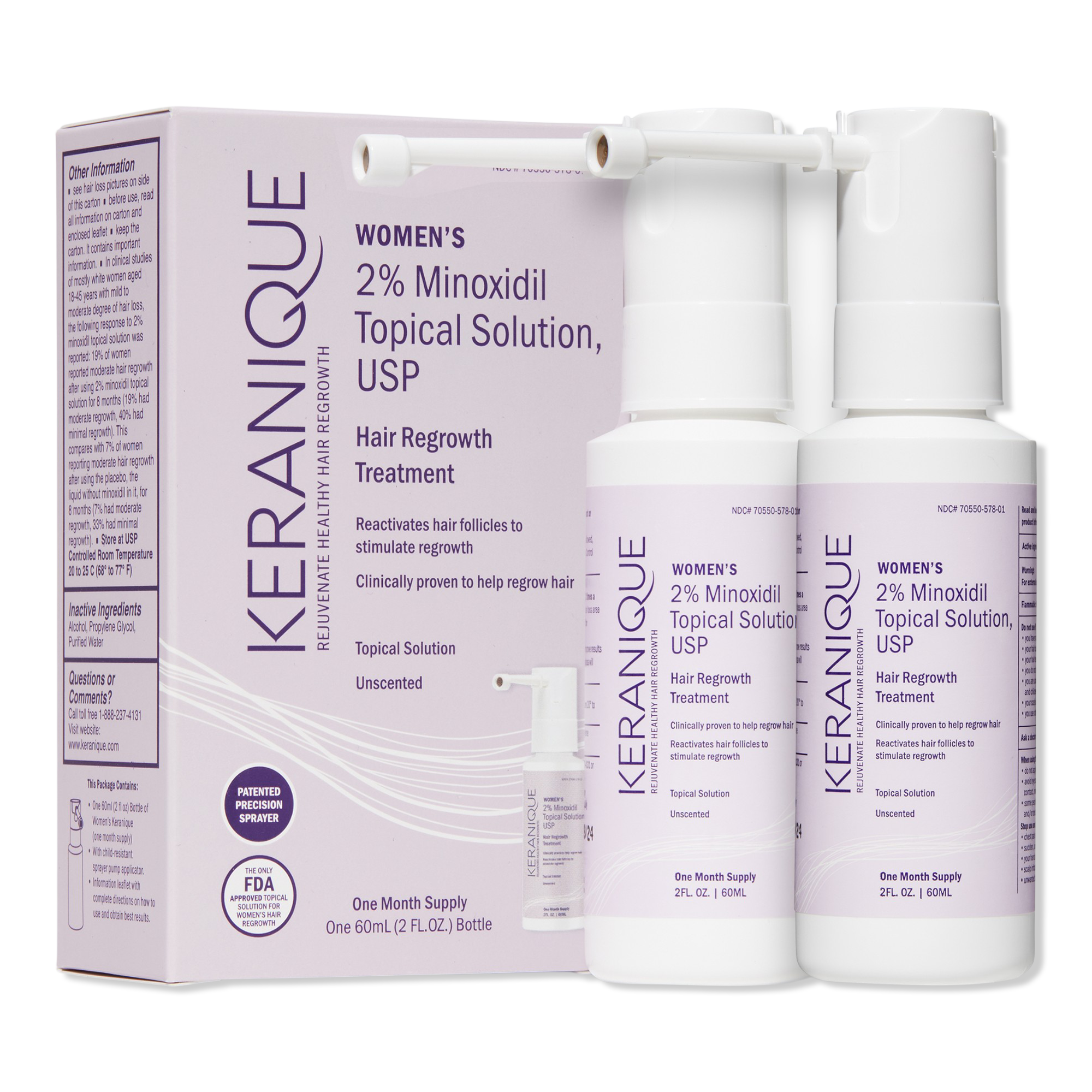 Keranique Hair Regrowth Treatment Easy Precision Sprayer is a hair treatment featuring 2% minoxidil, the only FDA-approved ingredient clinically proven to help women regrow hair. The patented easy-to-use sprayer allows for optimum precision to target areas of concern on the scalp. 60 Day Supply.