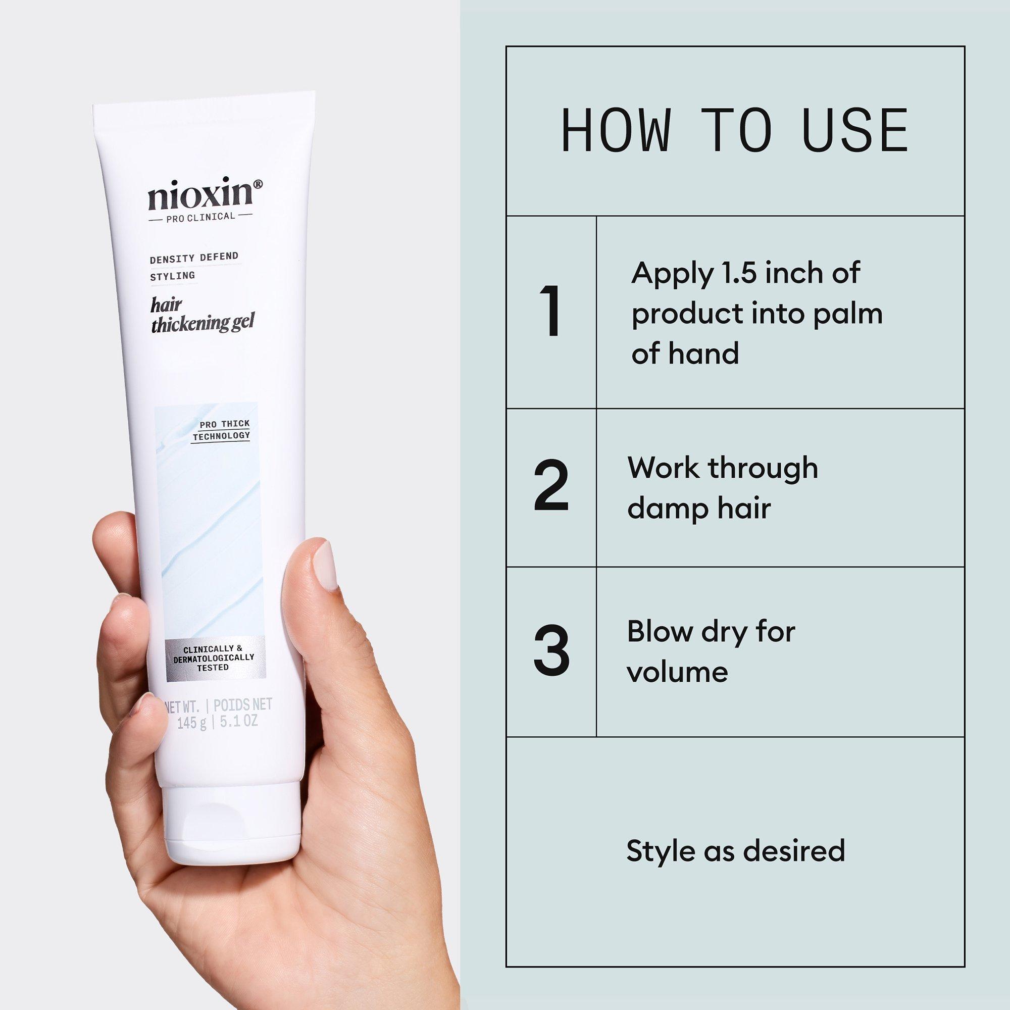 Apply a small amount of the thickening gel to damp or dry hair. Work it through the hair from roots to ends, paying attention to areas where you desire extra volume and definition. Style your hair as desired using your preferred hair styling tools. For optimal results, combine it with your recommended Nioxin Shampoo, Conditioner, and other styling products.