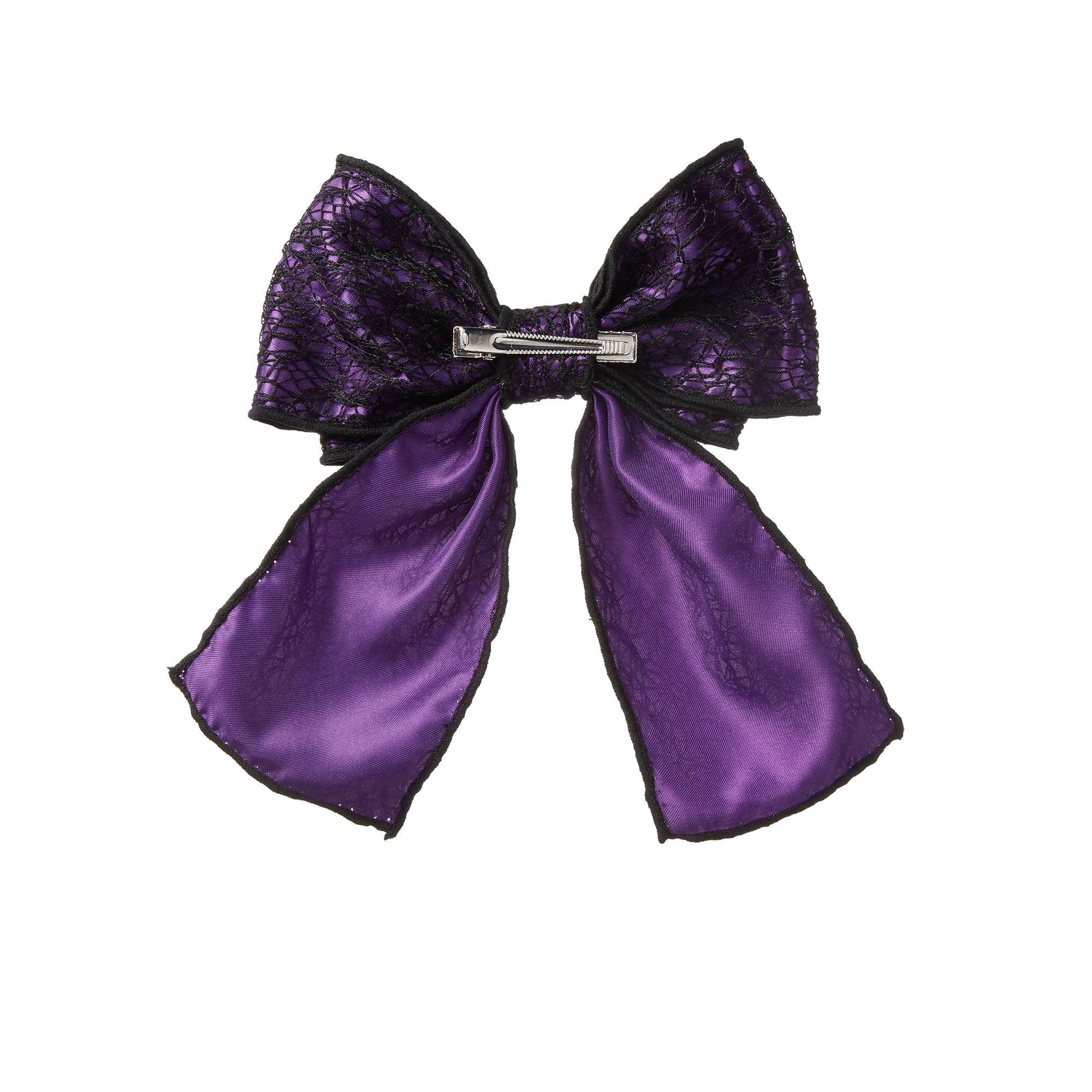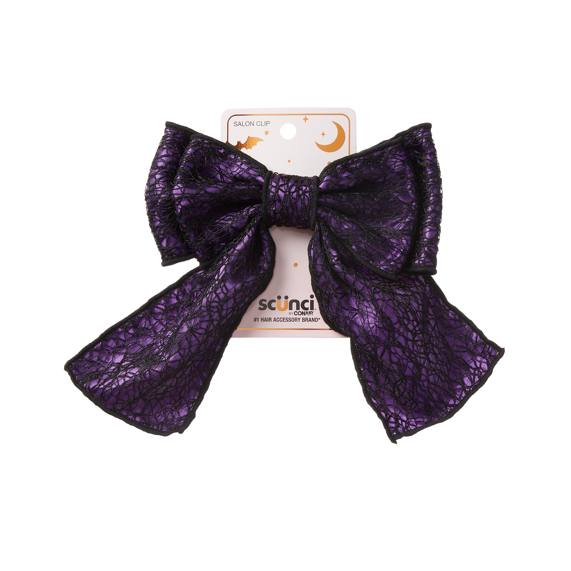 Boo-tifully crafted of purple material with a black spiderweb design, this scünci Halloween Bow Salon Clip holds back hair in spooky style.