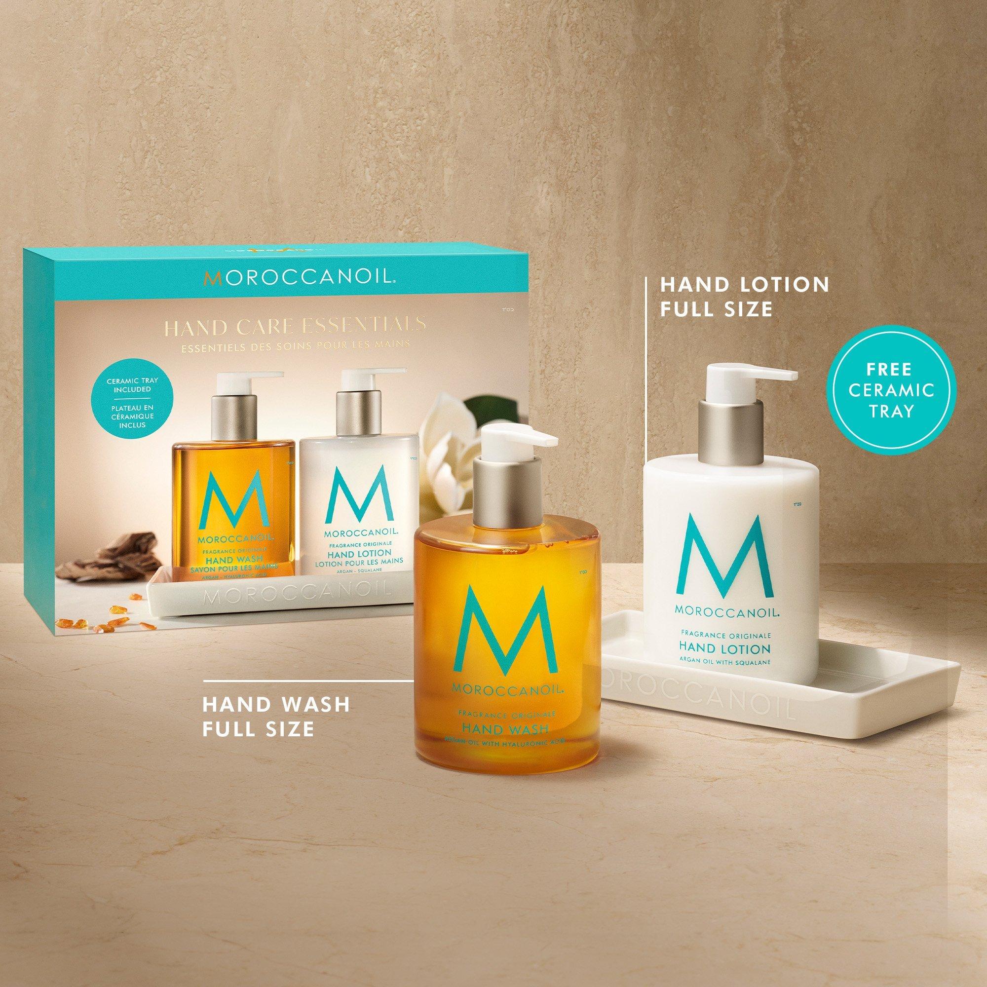 Moroccanoil's Hand Care Essentials Set is a giftable limited-edition set featuring the best-selling Hand Wash, Hand Lotion, and a FREE ceramic tray.