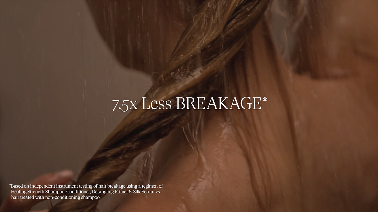 • *Based on independent instrument testing of hair breakage using a regimen of Healing Strength Shampoo, Conditioner, Detangling Primer & Silk Serum vs. hair treated with non-conditioning shampoo.