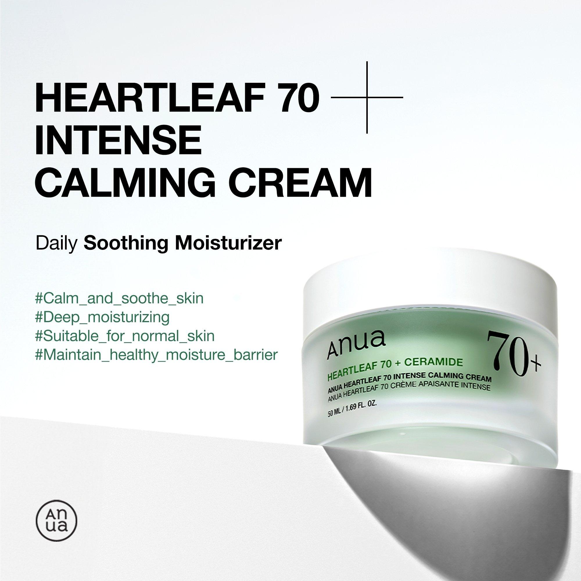 Anua Heartleaf 70 Intense Calming Cream infused with HEARTLEAF+, which is believed to have soothing and calming properties, and Ceramides provide hydration and helps maintain a healthy moisture barrier.