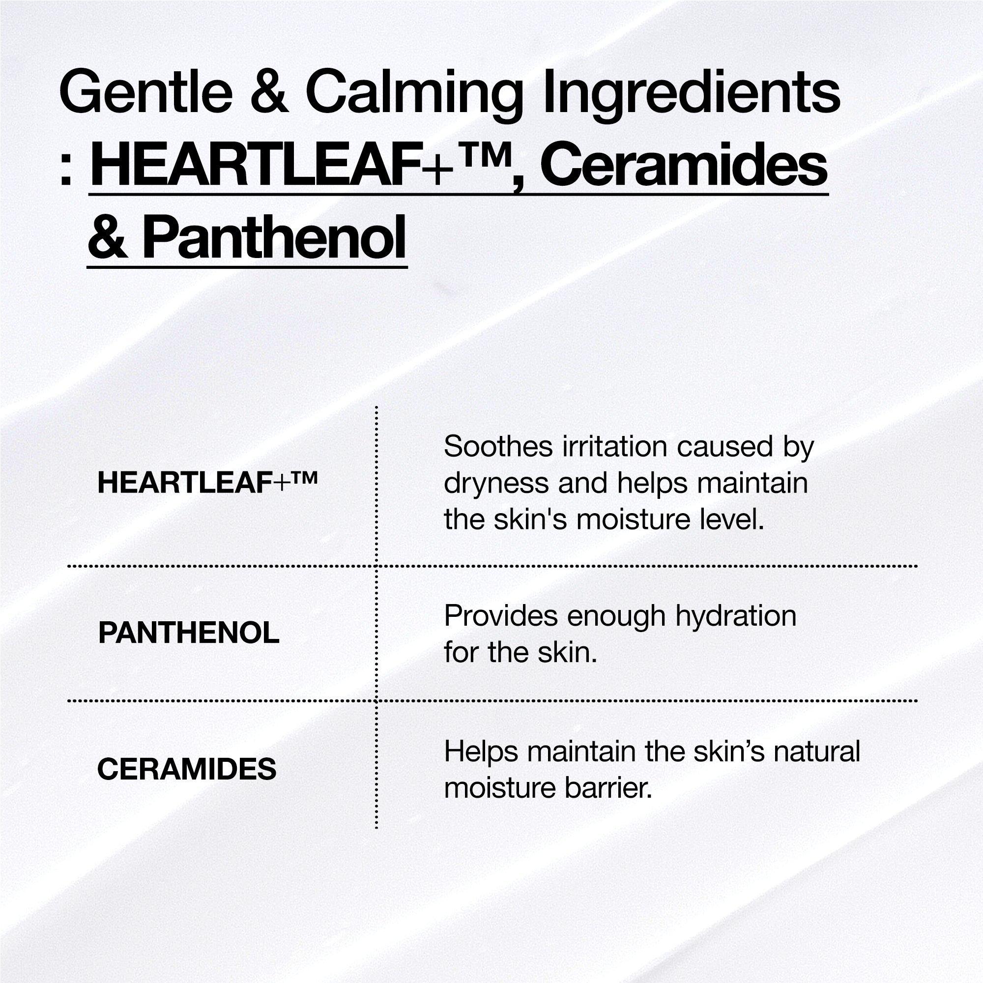 • HEARTLEAF+: Soothes sensitive skin irritations caused by dryness and helps maintain the skin's moisture