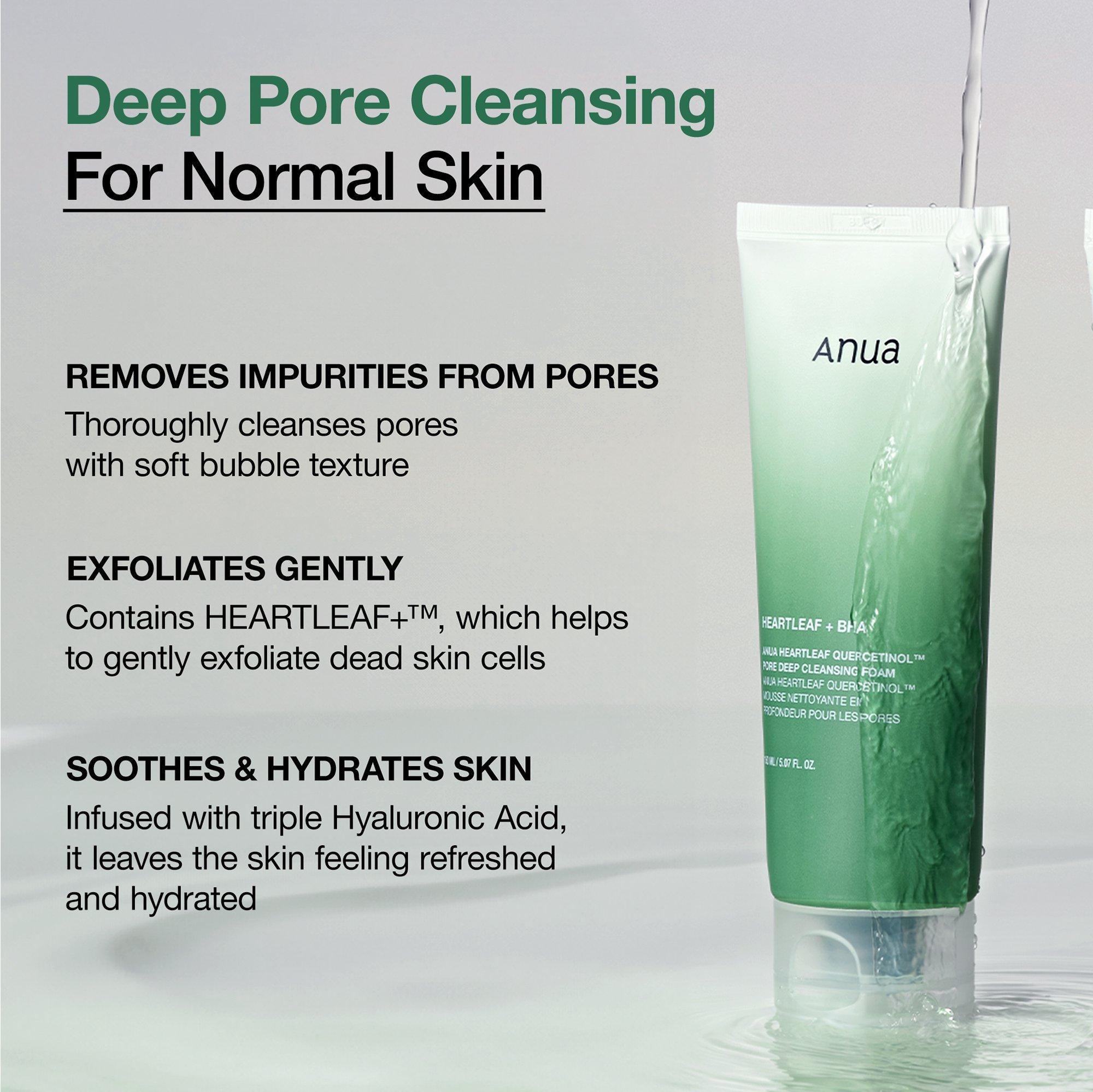 Anua Heartleaf Quercetinol Pore Deep Cleansing Foam infused with soothing ingredients and BHA that cleanses the skin and minimizes the appearance of pores.