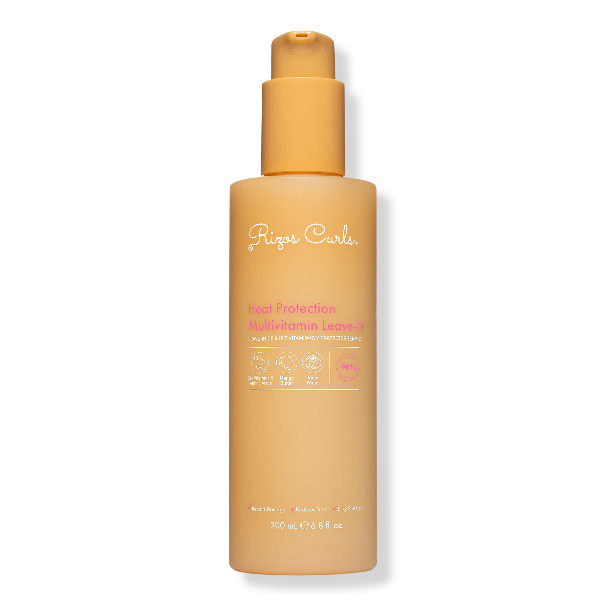 Rizos Curls Heat Protection Multivitamin Leave-In deeply nourishes, repairs and softens hair. This lightweight formula provides heat protection, while reducing frizz and breakage. Strengthens with 13+ Vitamins and Amino Acids, Mango Butter and Rose Water.