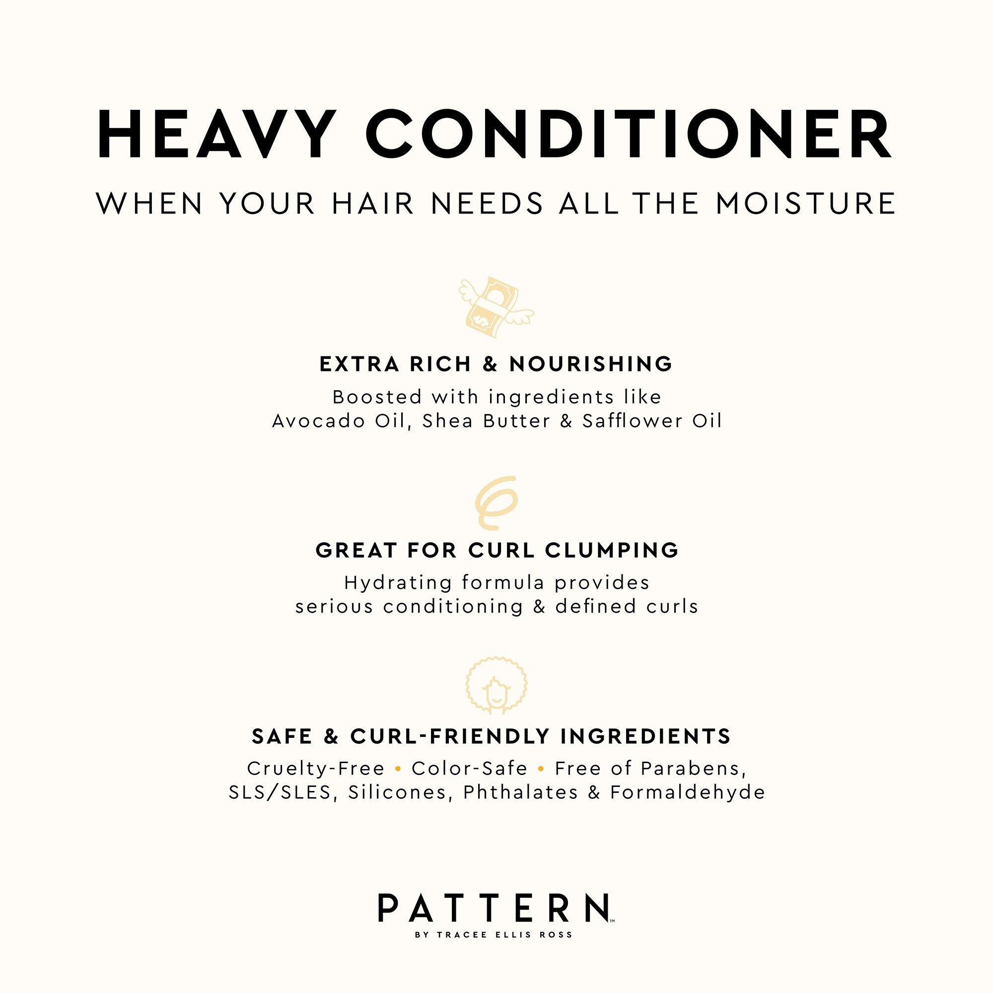 PATTERN's extra rich and nourishing Heavy Conditioner is perfect for coily and tight textured hair. Our creamy, buttery formula offers serious hydration and the signature “PATTERN slip” for easy detangling and great curl clumping.