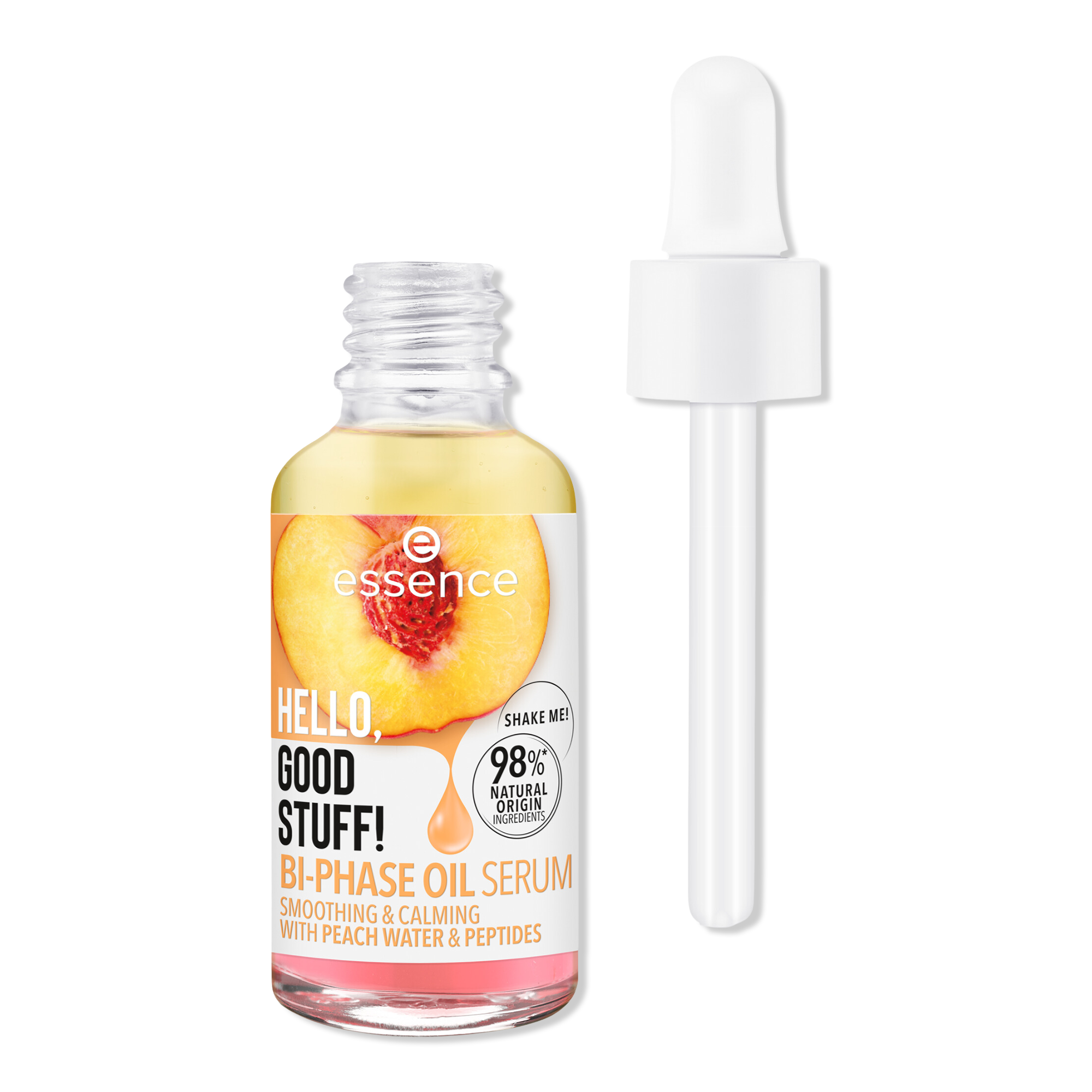 Essence Hello, Good Stuff! Bi-Phase Oil Serum is made with peach water and peptides which helps to refine and even out your skin tone. With 98% natural ingredients, the serum's lightweight formula is perfect applied alone or under makeup!