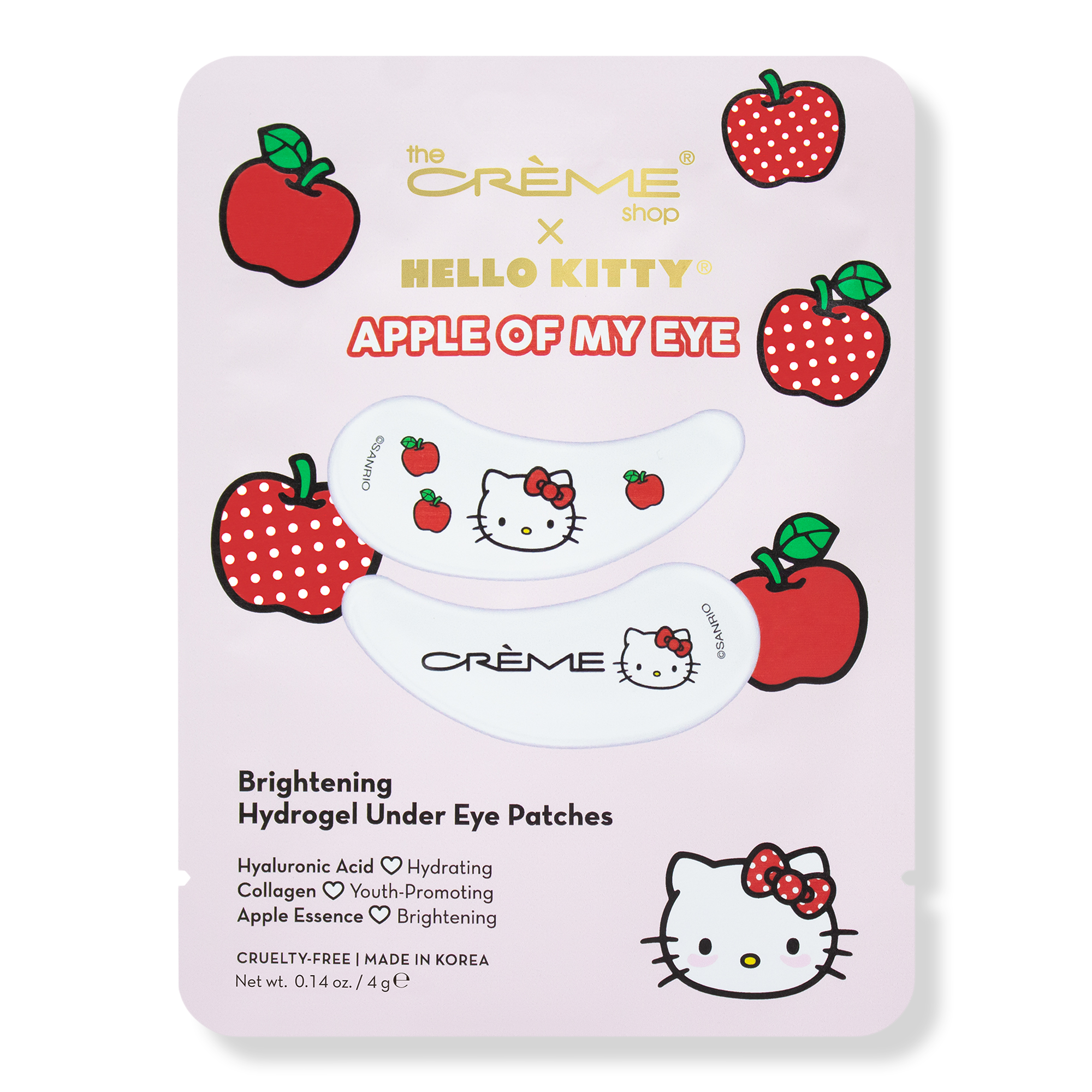 You've got a twinkle in your eye! Brighten up tired eyes with The Crème Shop's Hello Kitty Apple Of My Eye Brightening Hydrogel Under Eye Patches infused with Hyaluronic Acid, Collagen, and Apple Essence.