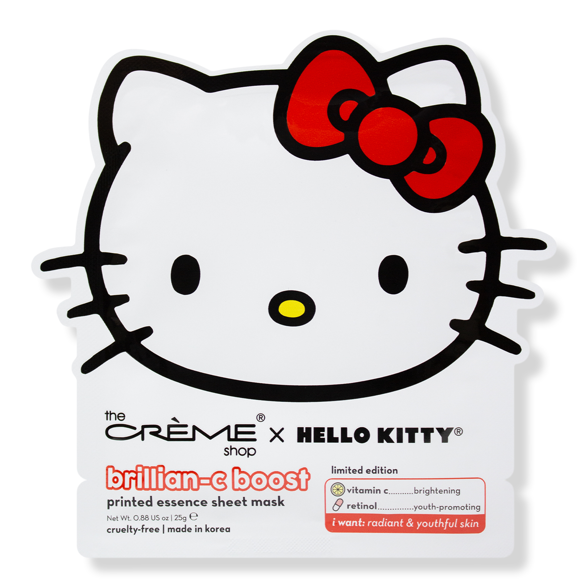 For a brillian-C boost and healthy skin! The Crème Shop x Hello Kitty Brillian-C Boost Printed Essence Sheet Mask pairs together brightening Vitamin C with youth-promoting Retinol to help you restore a supercute glow.