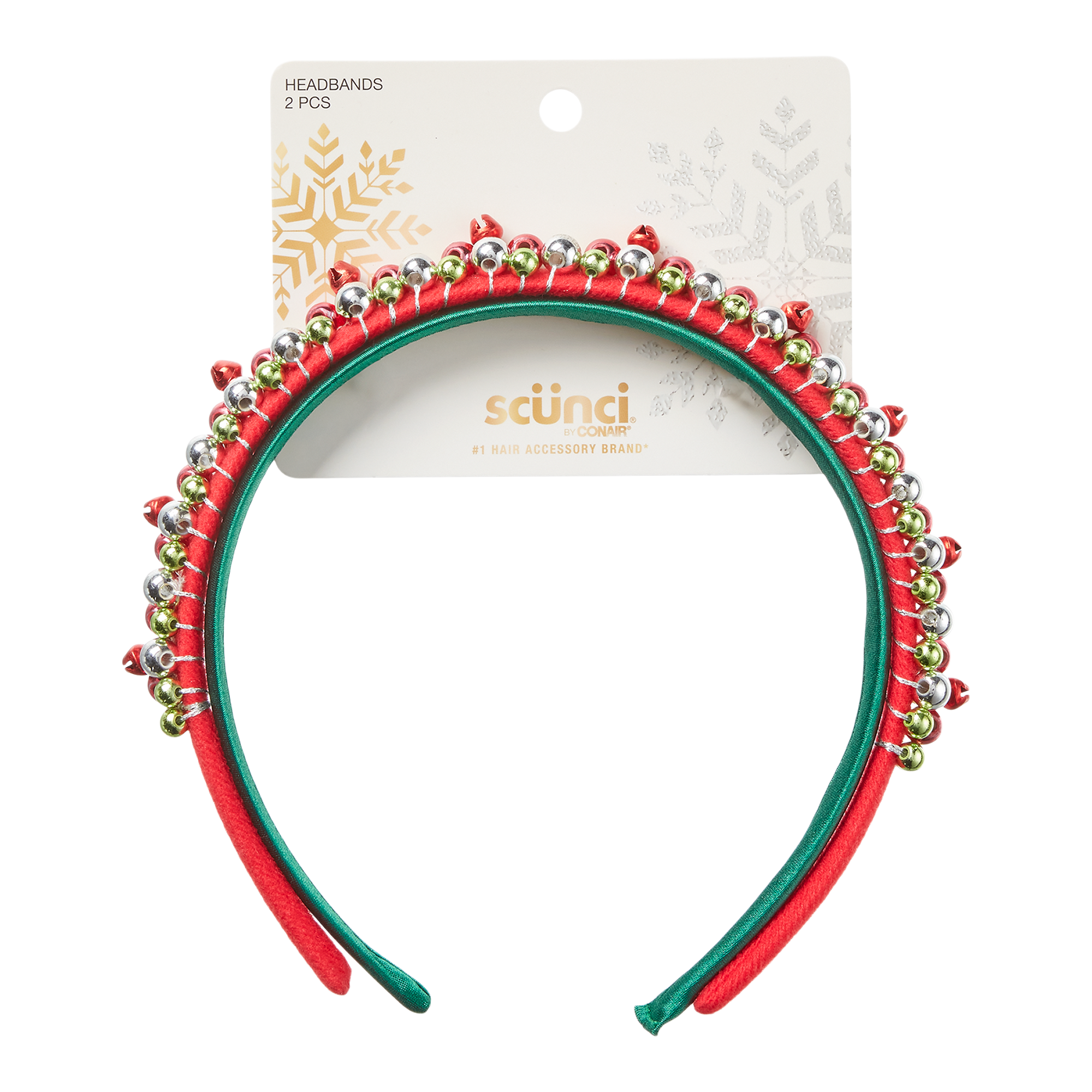 Jingle all the way! 2-pack of festive scünci® Holiday Bell Headbands features red band with baubles and bells that jingle plus simple green band to stack or wear solo.