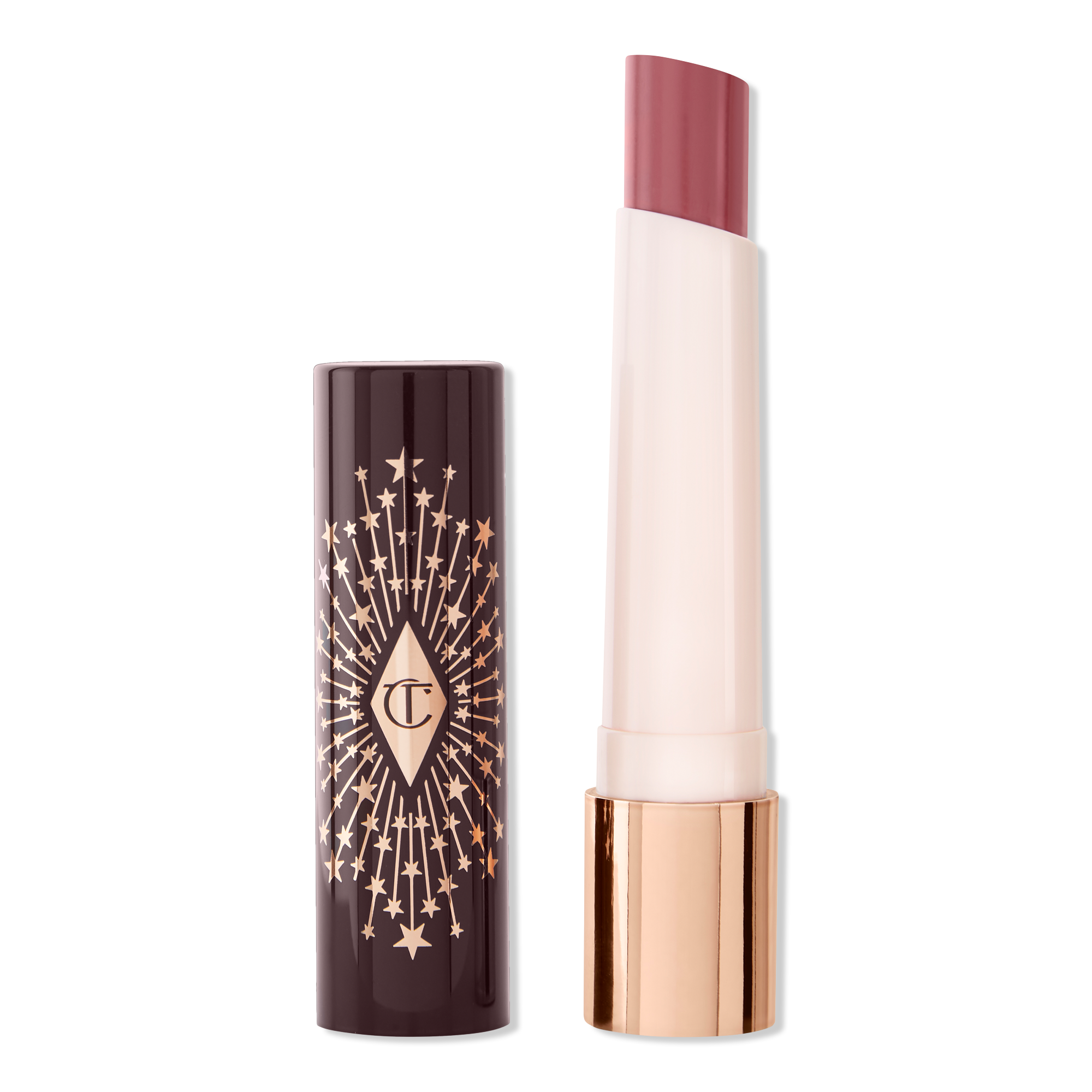 Charlotte Tilbury's Hyaluronic Happikiss Lipstick Balm with a hyaluronic-acid-infused formula that provides the hydrating power of a balm with the color payoff of a lipstick for a pigmented, dewy lip look.