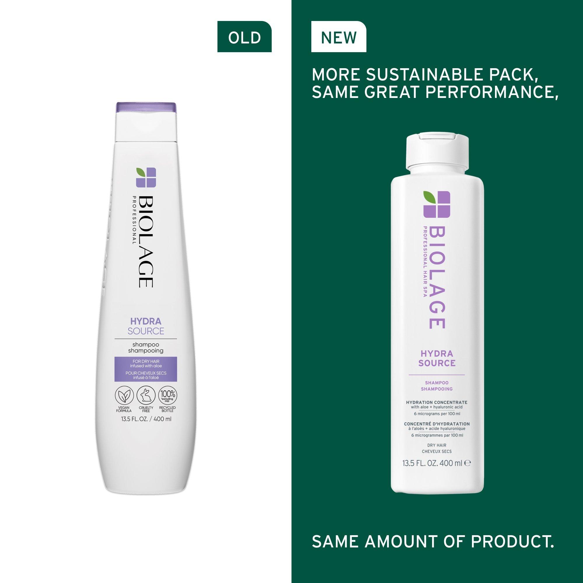 Quench dry hair with Biolage Hydra Source Shampoo for Dry Hair. Infused with micro-filtered aloe vera and fermented hyaluronic acid, this hydrating shampoo gently cleanses while restoring moisture and adding shine for hair that's soft, touchable, and full of life.