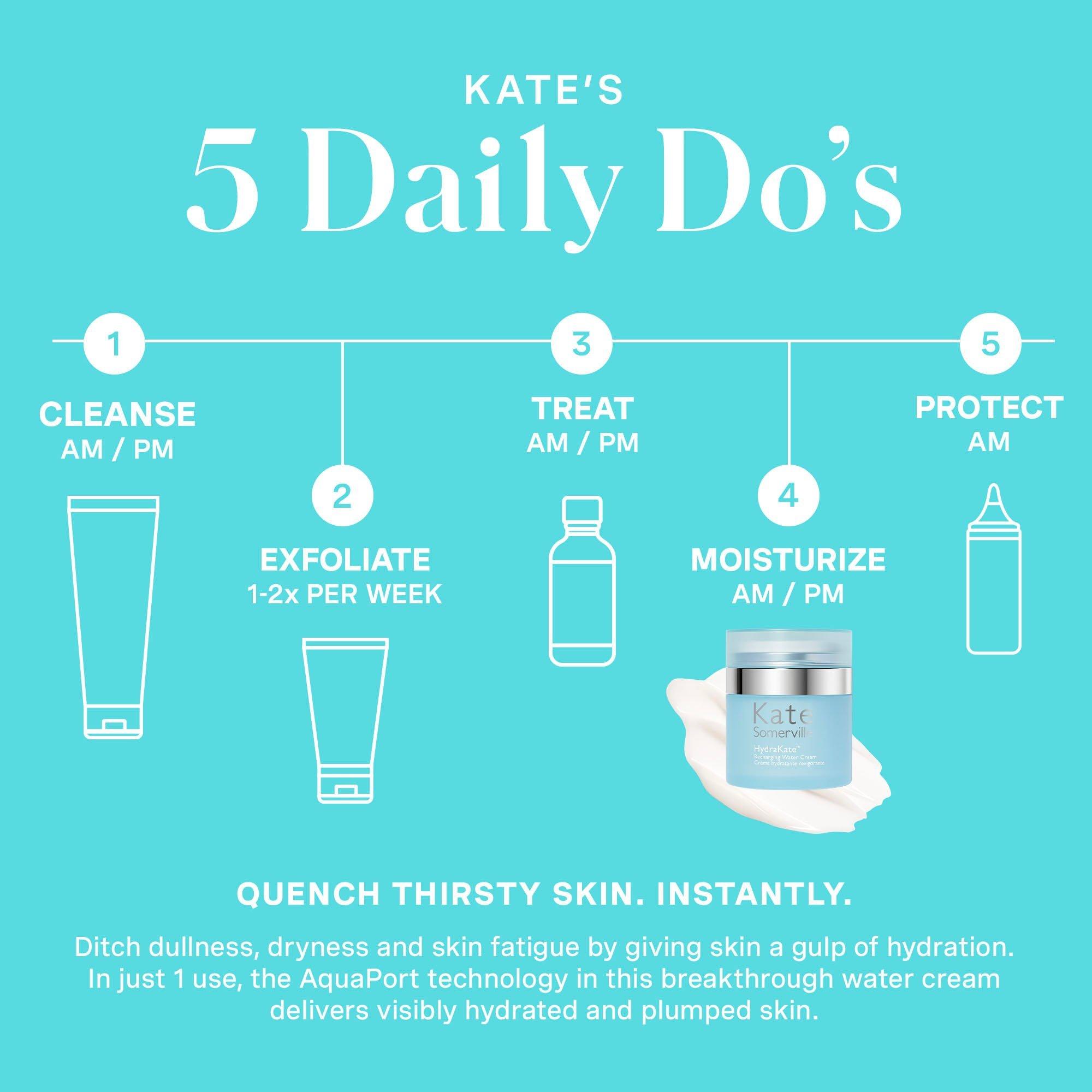 The ultimate solution for targeting visible signs of skin dehydration. Kate Somerville's HydraKate Recharging Water Cream Moisturizer is expertly formulated with Nobel Prize-inspired AquaPort Technology + Hyaluronic Acid to deliver instant and lasting hydration exactly where + when skin needs it.