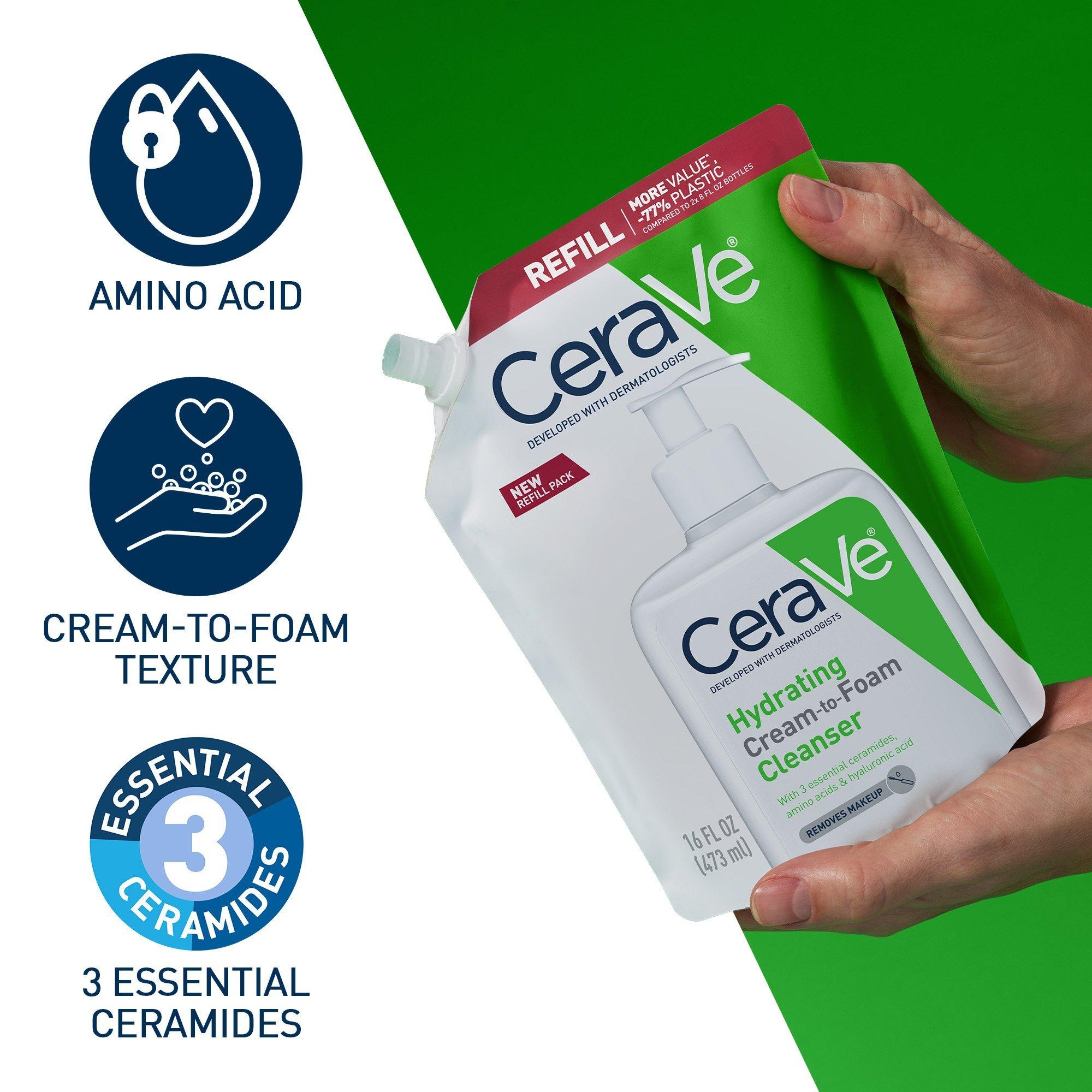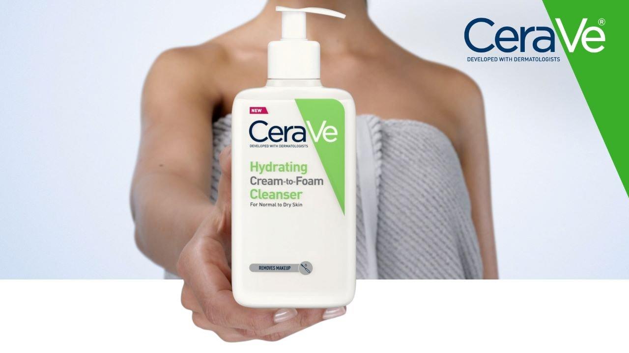 CeraVe Hydrating Cream-to-Foam Cleanser with hyaluronic acid for balanced to dry skin removes oil and makeup while reinforcing the skin barrier with ceramides.