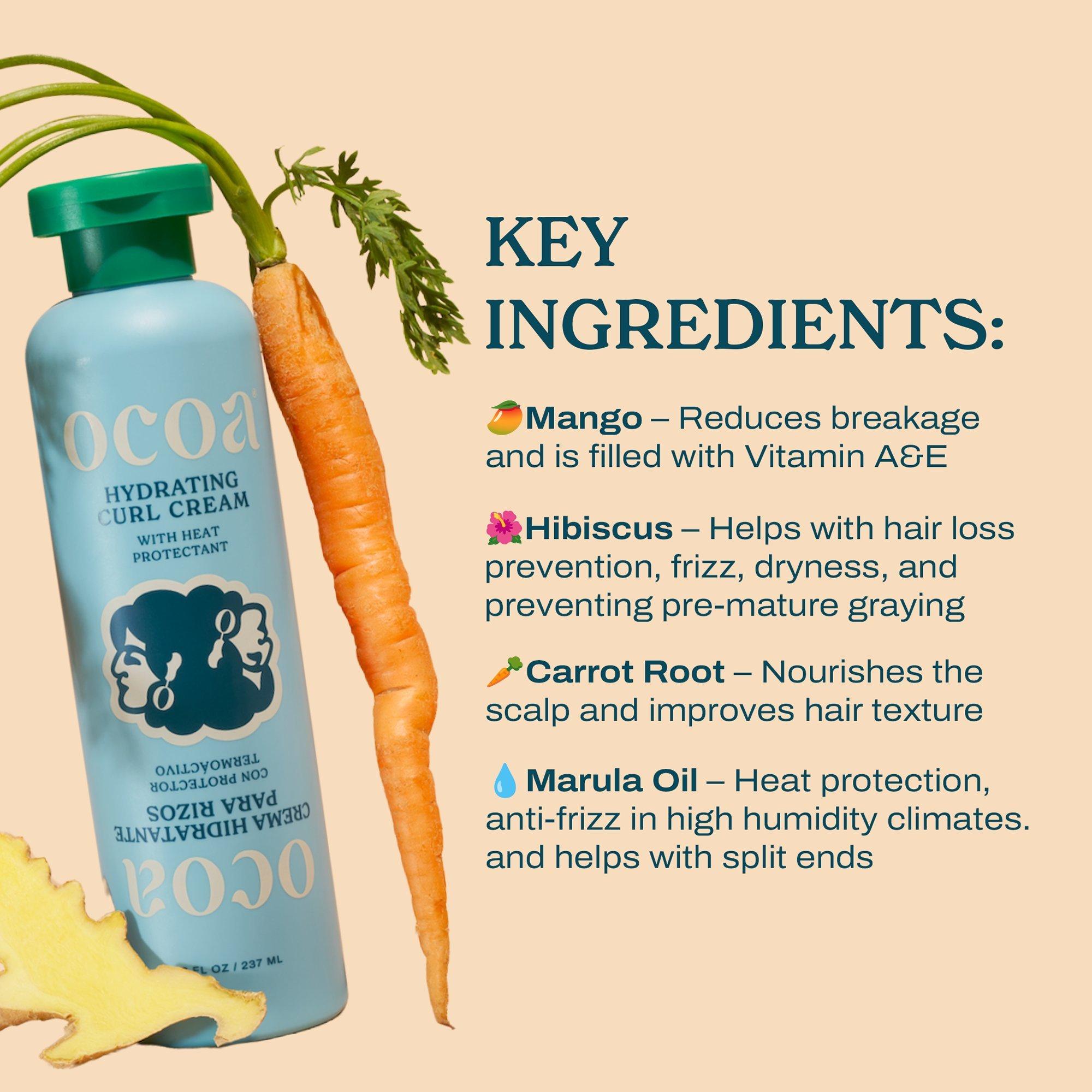 OCOA's Hydrating Curl Cream is made with nourishing ingredients like Hibiscus, Mango butter, and Marula oil. Use it to define, hydrate, and protect from heat styling. For curly or wavy hair.