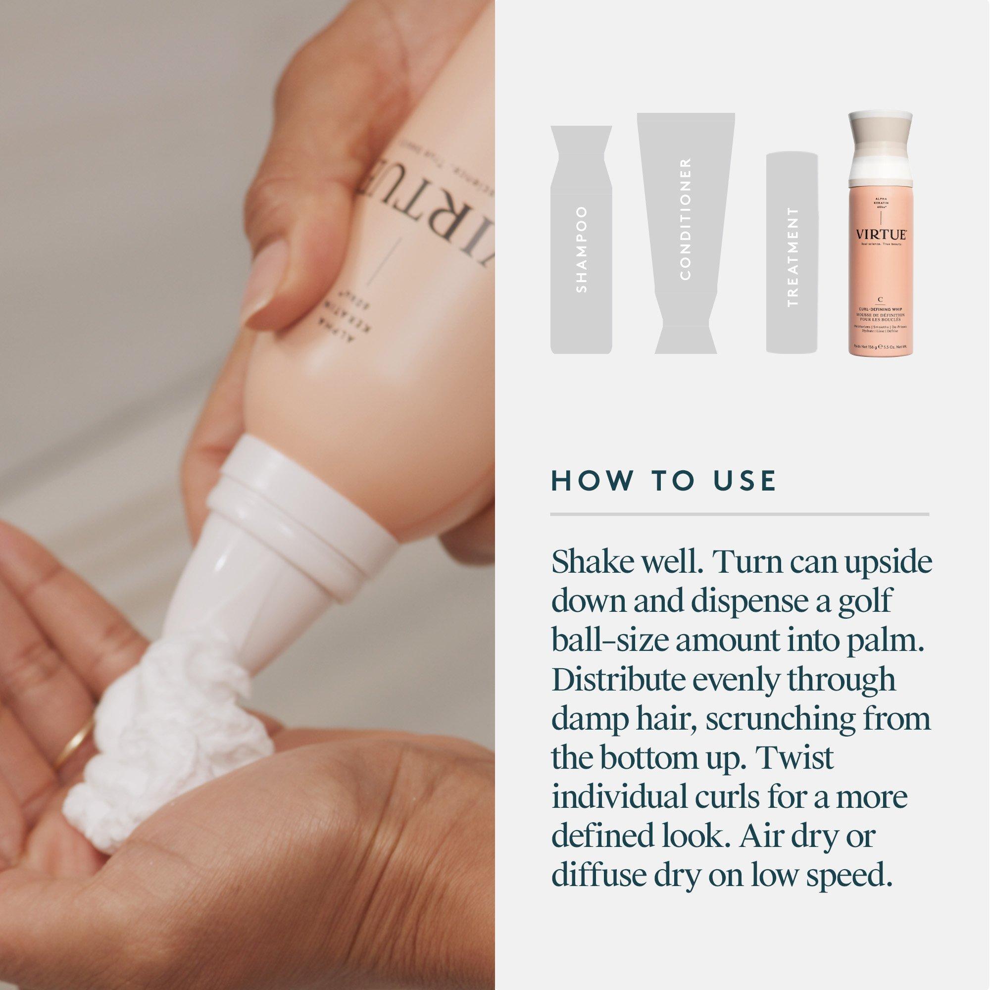 Shake well. Turn can upside down and dispense a golf ball-size amount of product into palm. Distribute evenly through damp hair, scrunching from the bottom up. Twist individual curls for a more defined look. Air dry or diffuse dry on low speed.