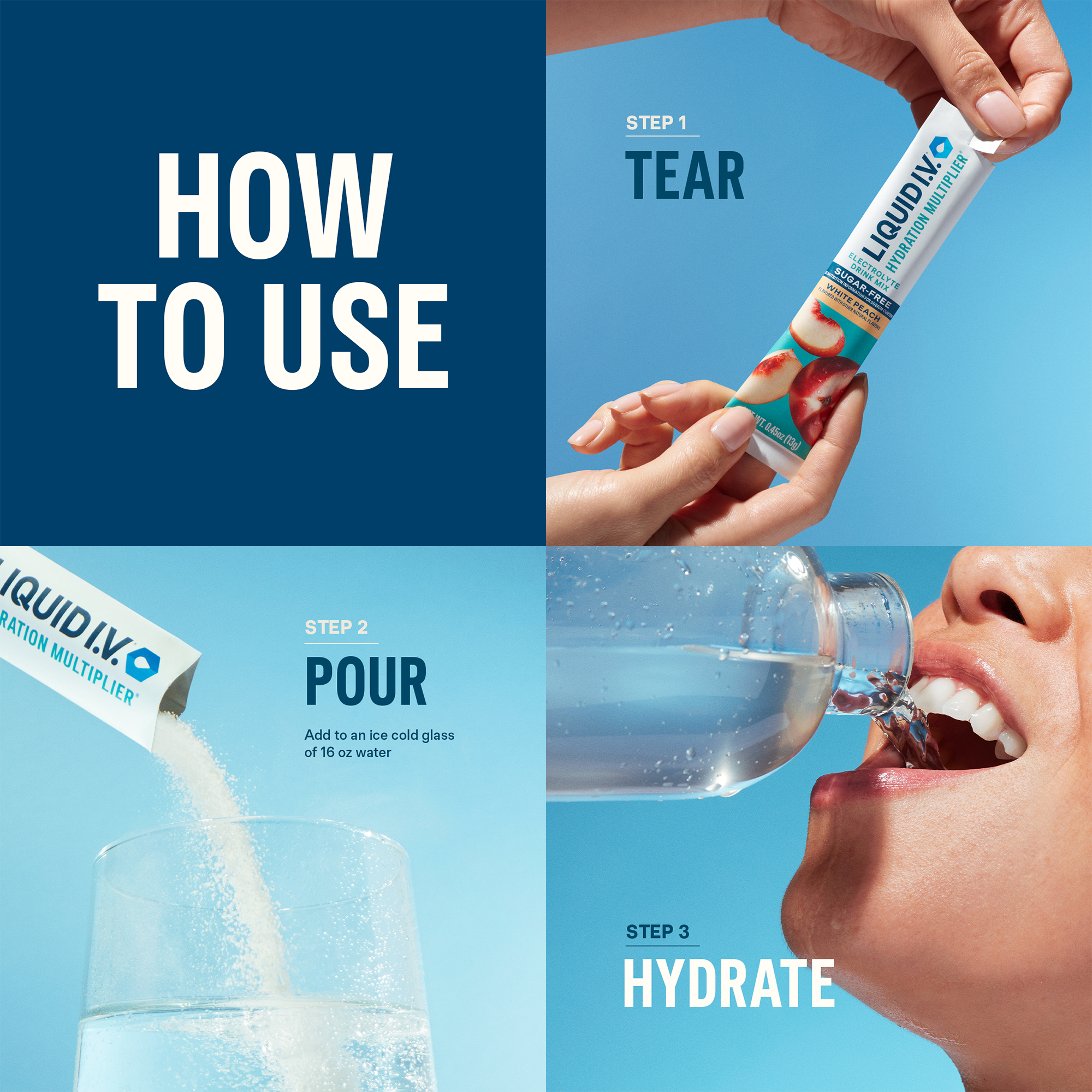 Mix one stick of Liquid I.V.® with water as directed on packaging. For Hydration Multiplier® Sugar-Free they recommend mixing 1 stick with 16oz of water.