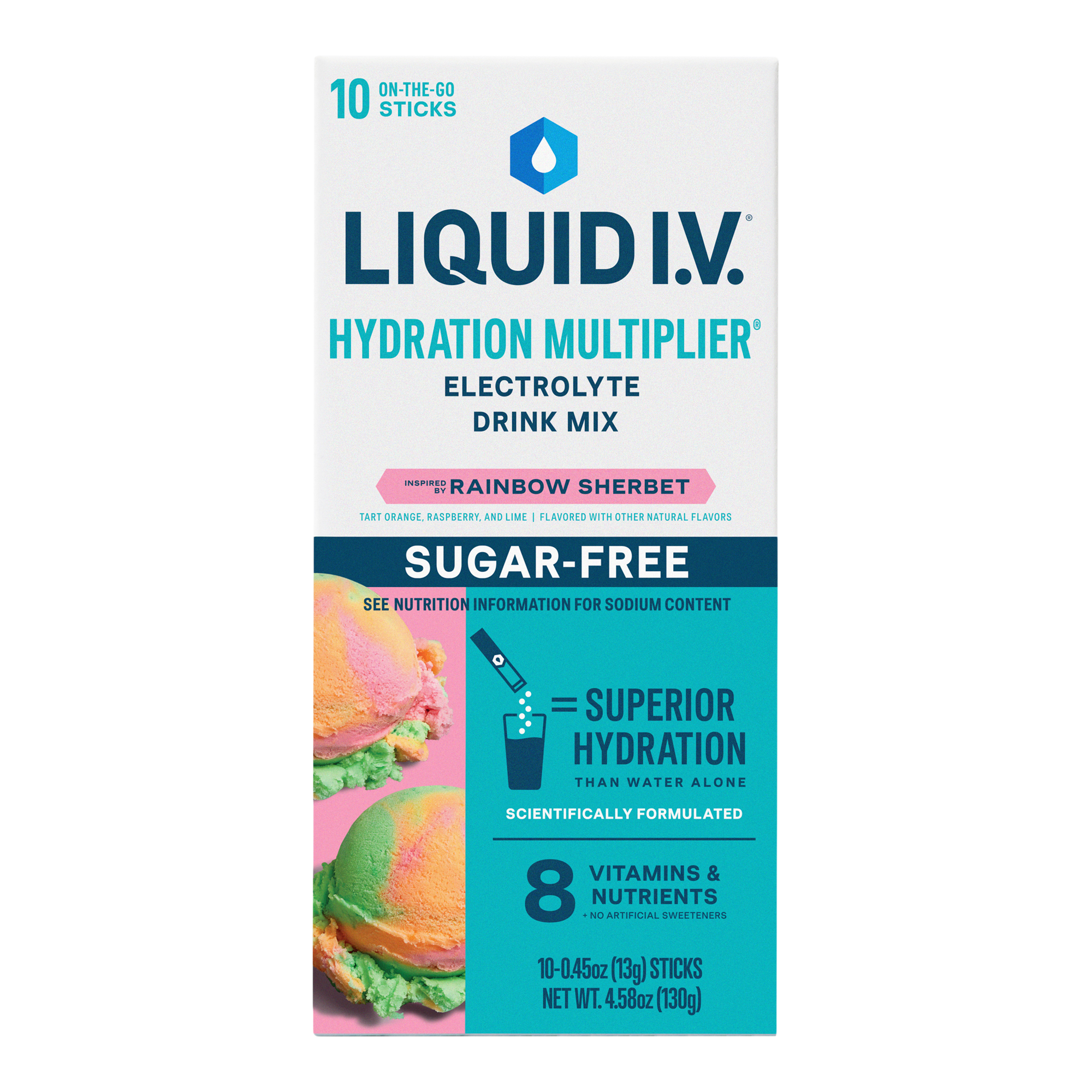 LIQUID I.V. Hydration Multiplier Electrolyte Drink Mix Sugar Free Rainbow Sherbet swirls together notes of honeyed raspberry, orange peel, and zesty lime flavors.