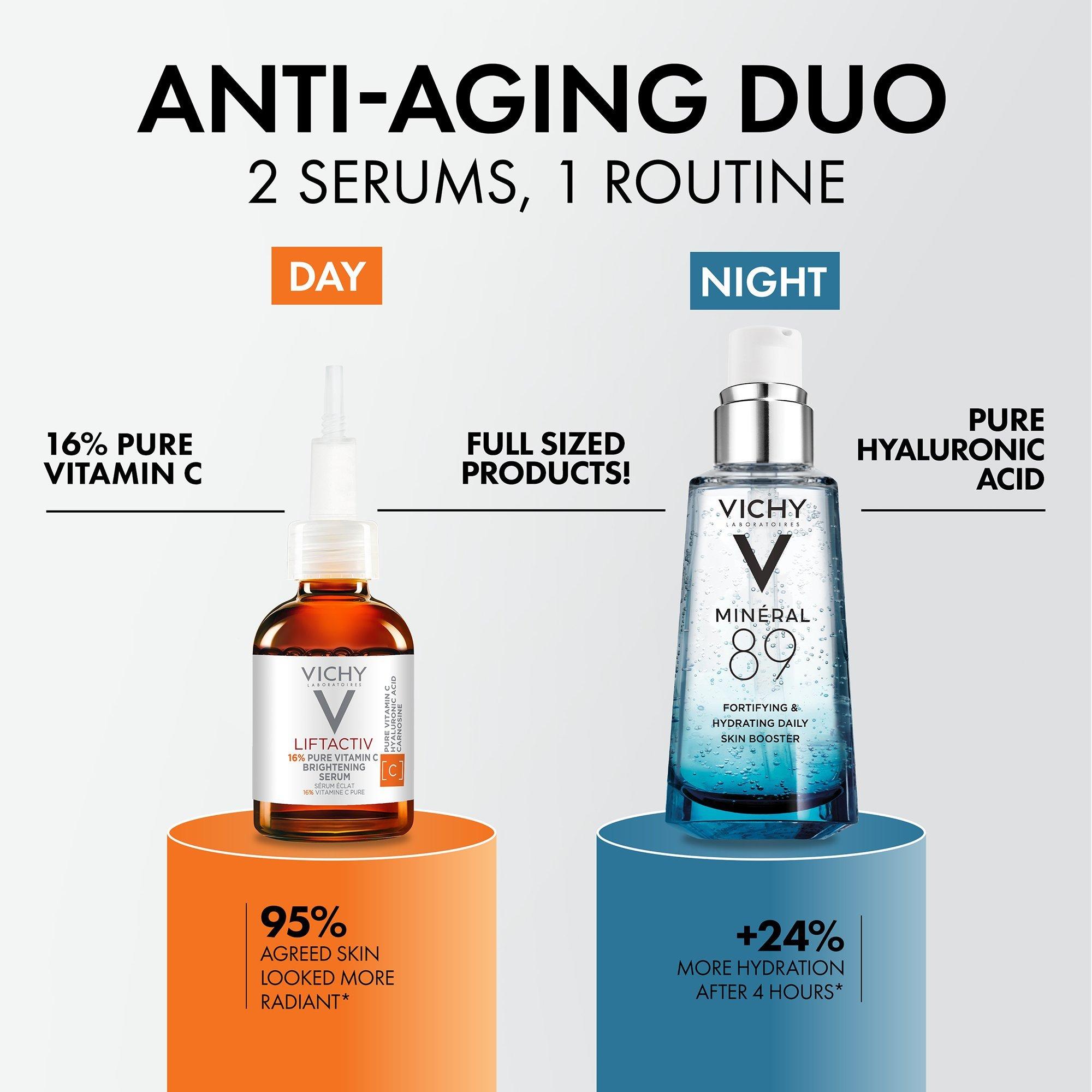 The Vichy Hydration + Radiance Face Serums Value Kit combines the power of Hyaluronic Acid and 16% Pure Vitamin C for long-lasting hydration and visibly brighter skin.