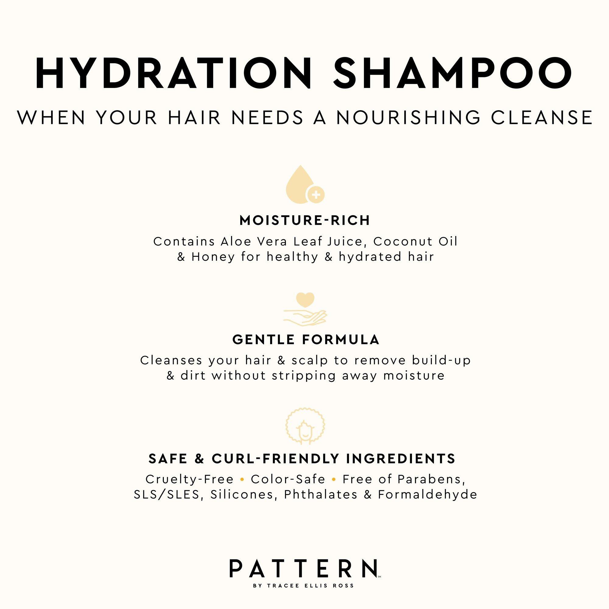 Boosted with 10 nourishing oils, PATTERN's creamy, gentle Hydration Shampoo cleanses curls and scalp and removes buildup and dirt without stripping away moisture. Bathe hair in a moisture-rich formula with ingredients like Honey, Aloe Vera and Coconut Oil.