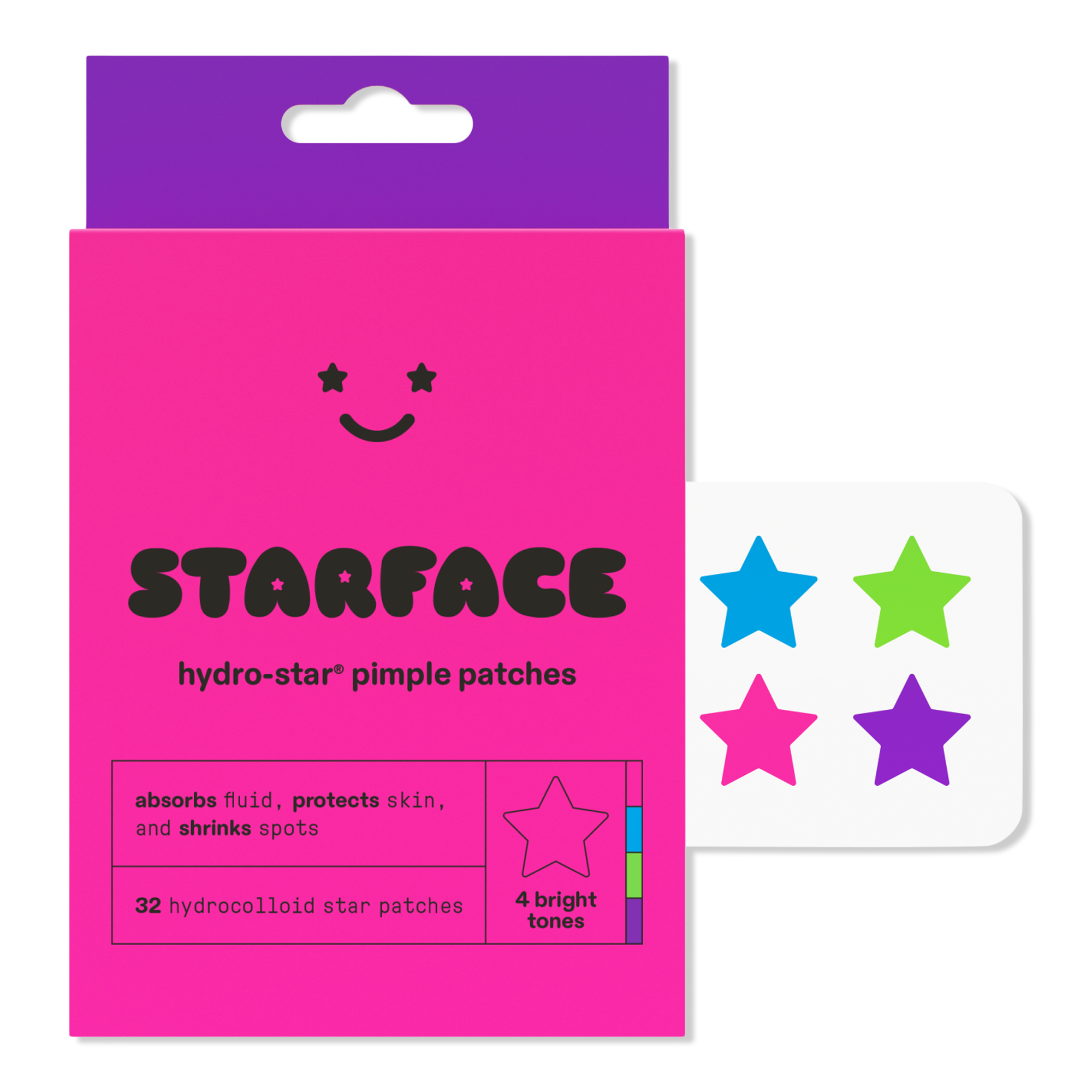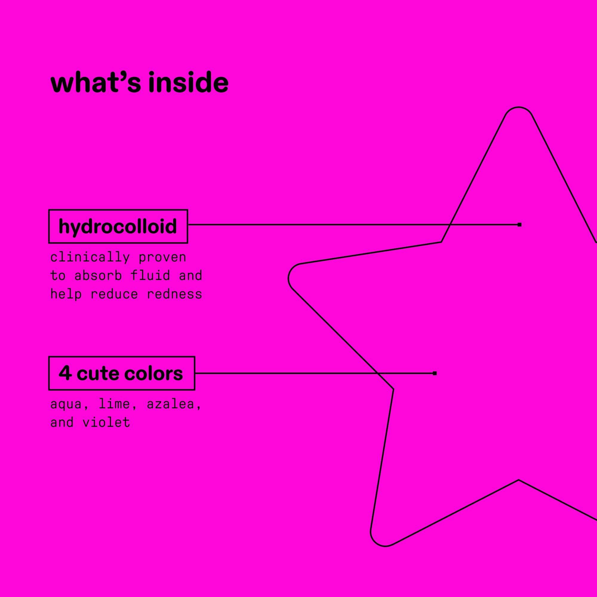 Express yourself and feel cute with Starface Hydro-Star Pimple Patches: a pack of hydrocolloid pimple protectors that help absorb fluid, reduce redness, and shrink spots.