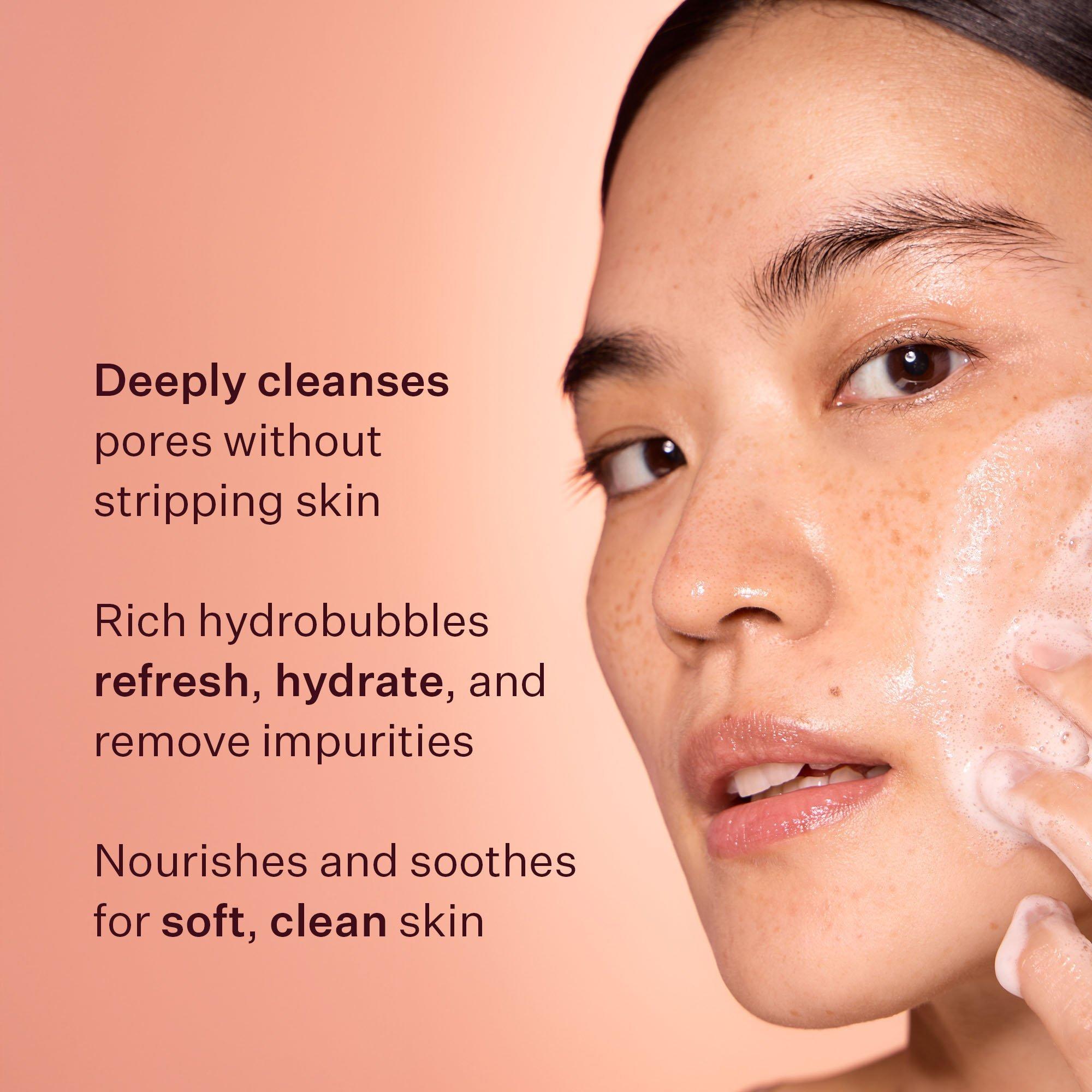 Peach & Lily's super lathering Hydrobubble Deep Foam Cleanser gently and effectively cleanses–without stripping skin. Rich, hydrating hydrobubbles lift dirt, oil, and impurities from pores while 9 botanical and root extracts nourish, brighten, and soften. Skin looks and feels fresh and clean.