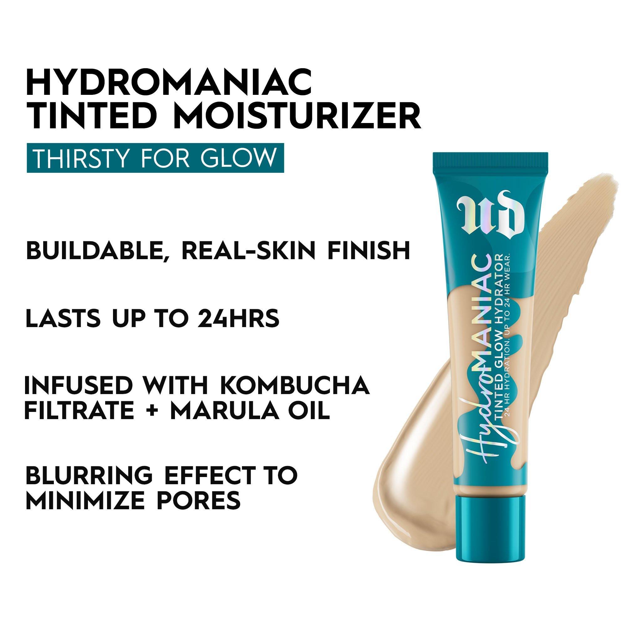 Urban Decay Hydromaniac Hydrating Dewy Foundation is a moisturzing, long-lasting medium coverage foundation with a dewy finish infused with kombucha filtrate + marula oil for glowy skin.