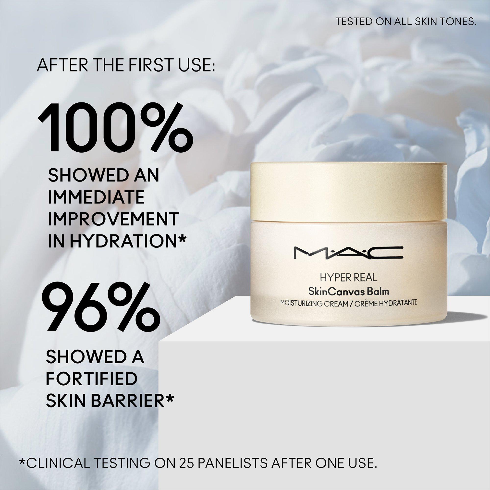 MAC Hyper Real Skincanvas Balm Moisturizing Cream is a moisturizing cream that strengthens and protects skin's barrier for overall healthier-looking skin. Smooths skin immediately and over time while soothing and preventing visible irritation for supple, petal-soft skin with a healthy-looking glow.