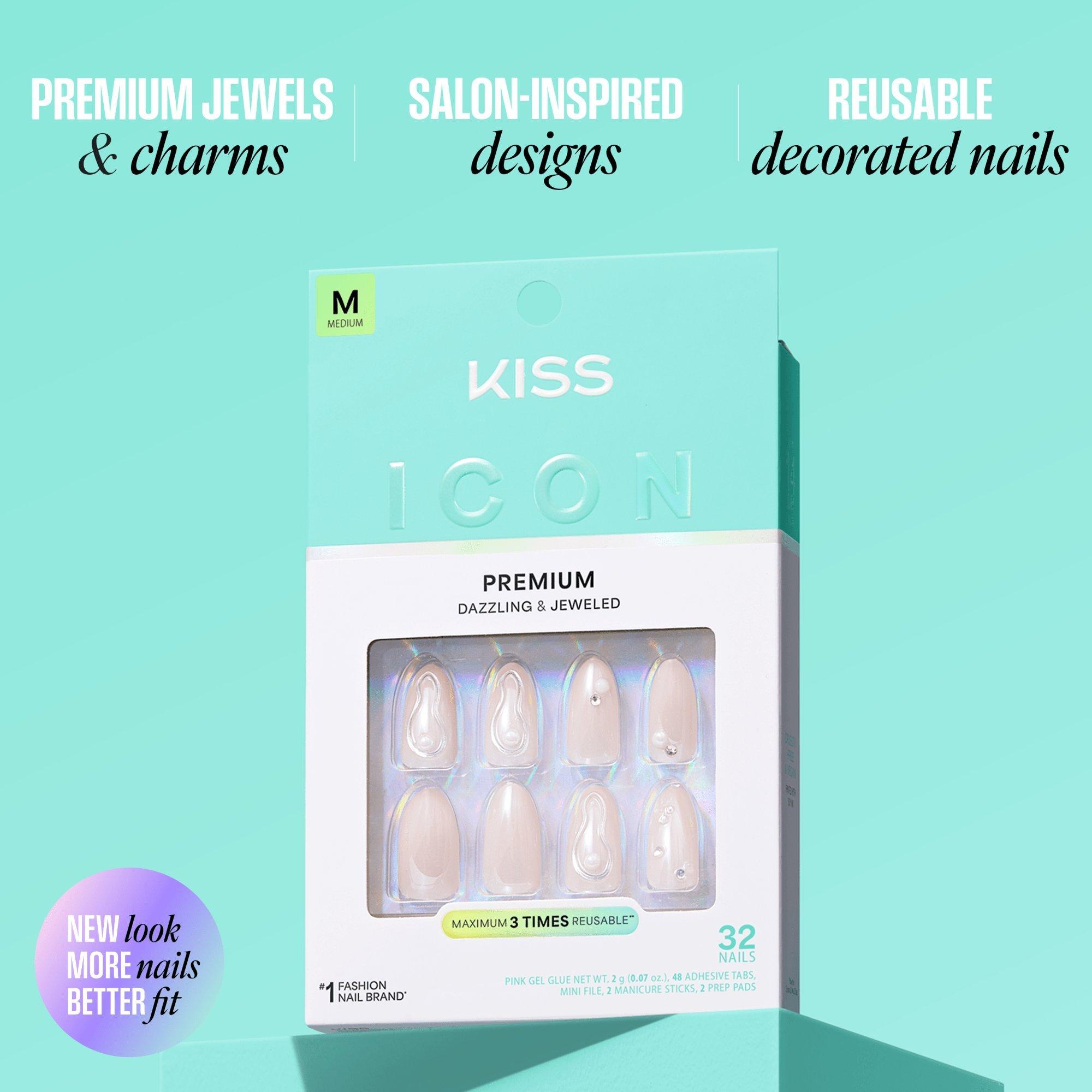 NEW Look. MORE Nails. BETTER Fit! KISS ICON Premium Press On Nails are designed with radiant jewels, stones, glittering finishes and 3D effects, to recreate the brilliance of a high-end salon manicure. This most adorned collection is also reusable; you can wear each set up to three times!